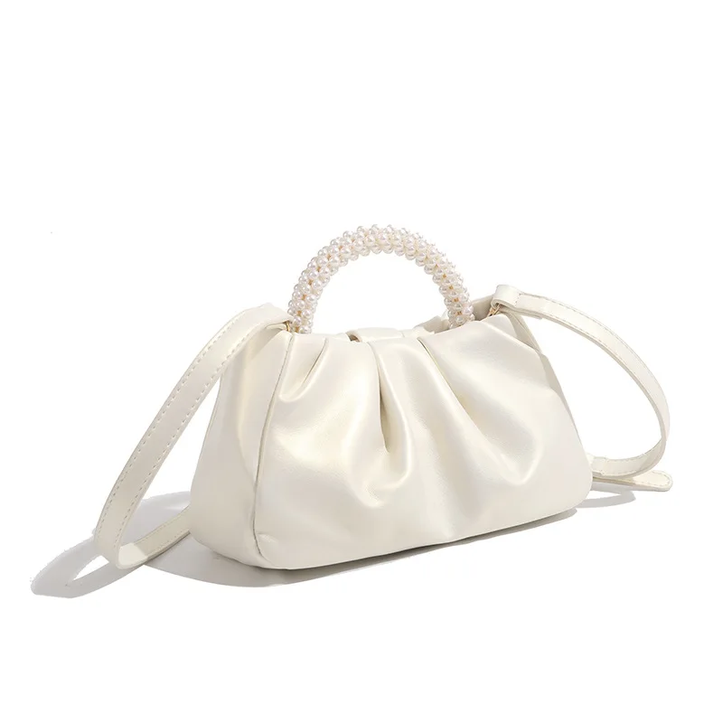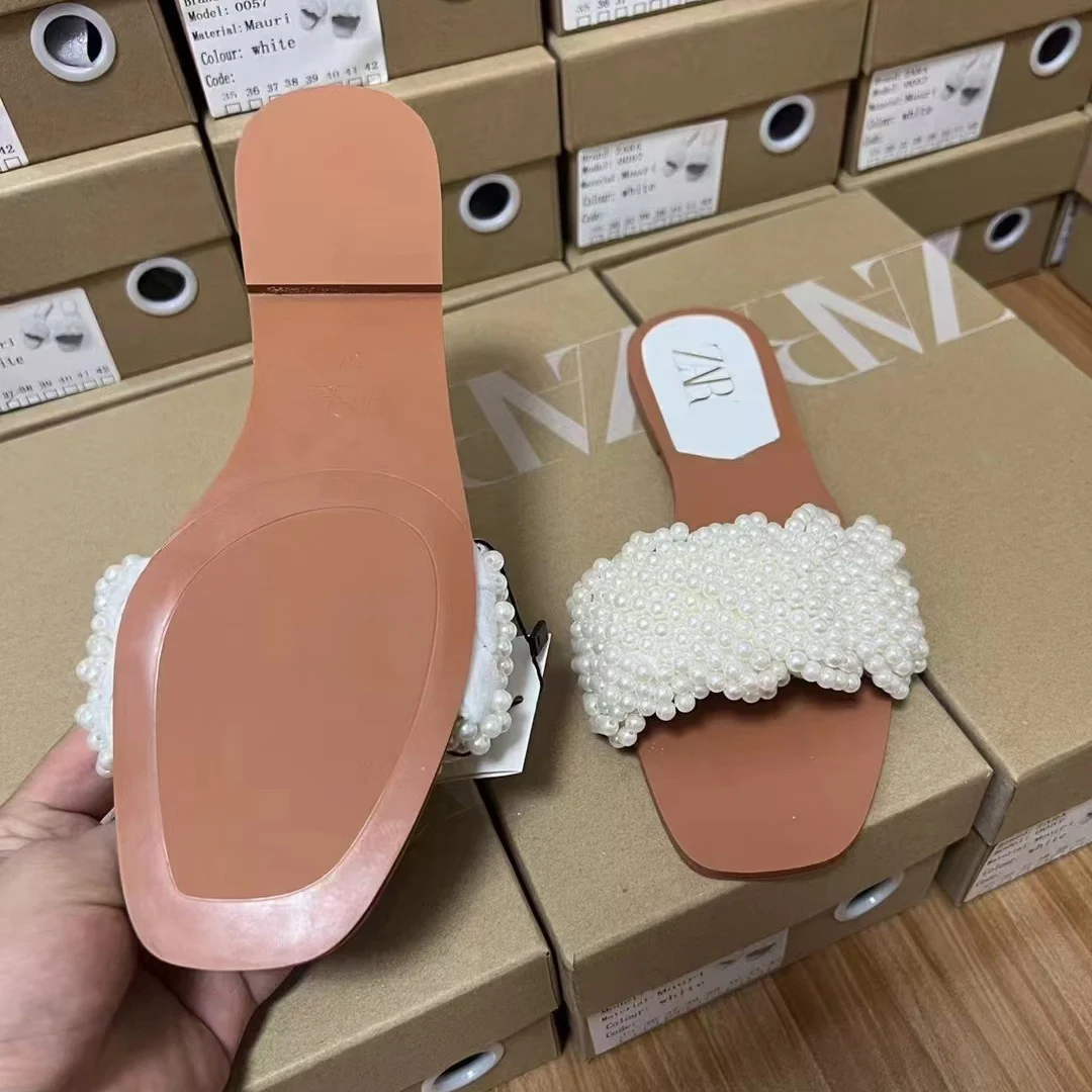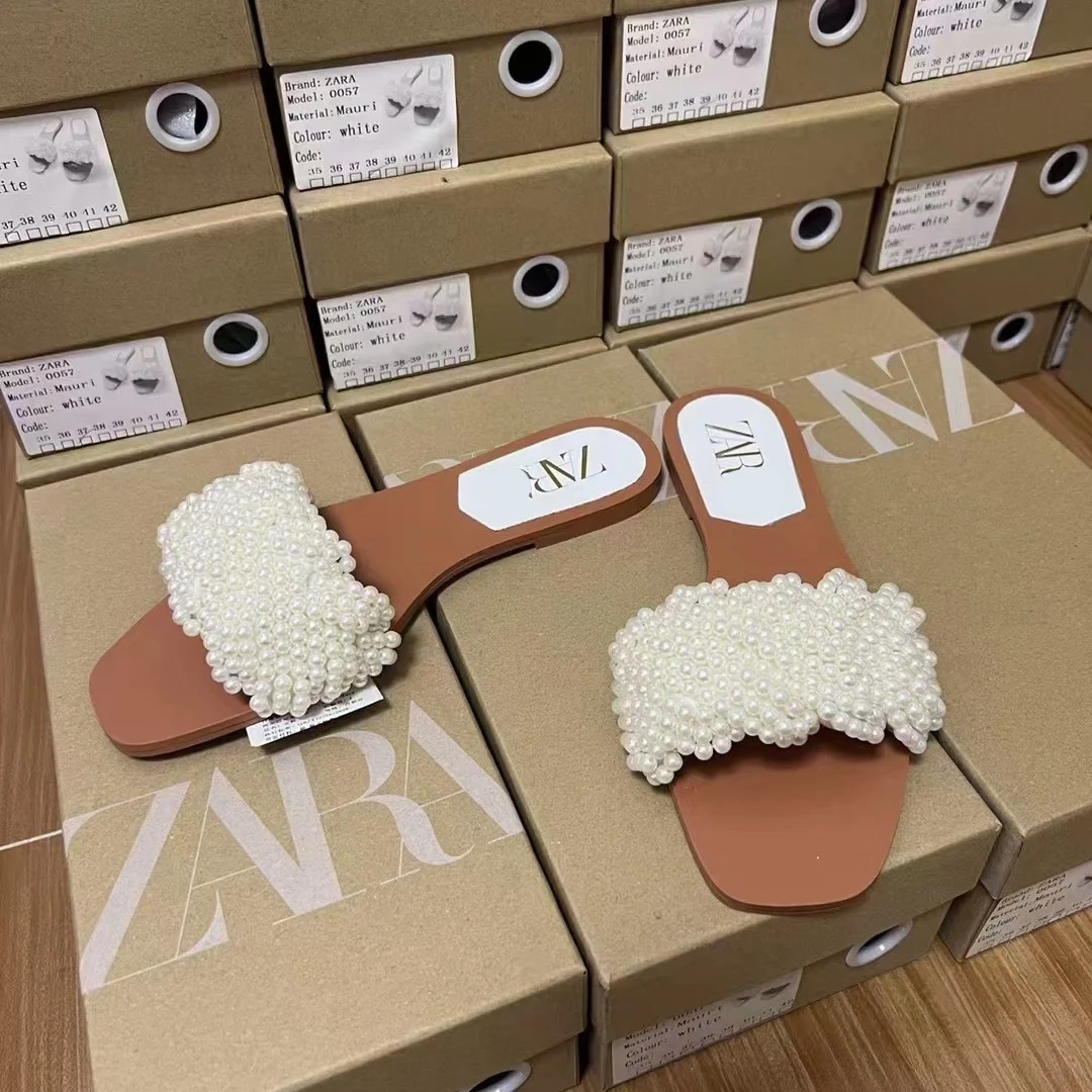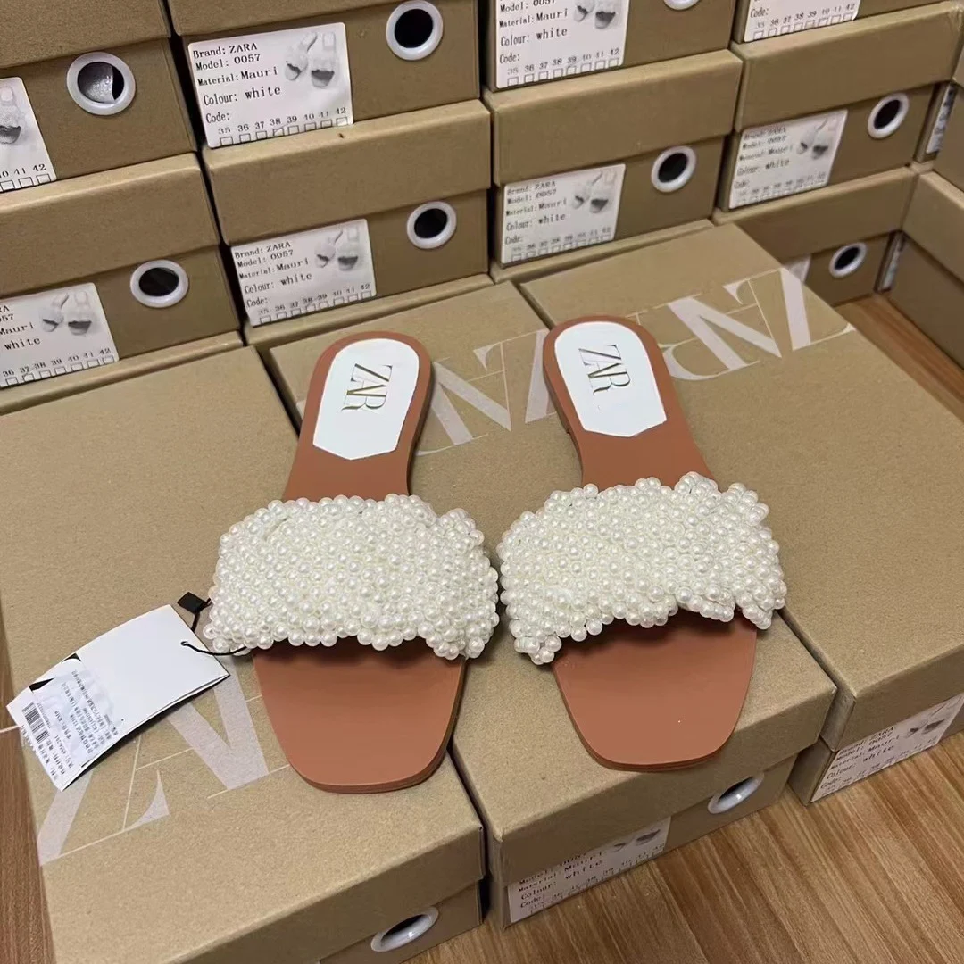 2025 Summer New Product Women's Shoes White Pearl Weaving Flat Sandals Outerwear Fashion Cool Slippers Pearl Bag Shoe Bag Set