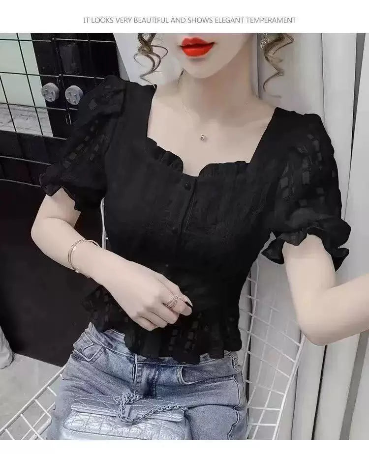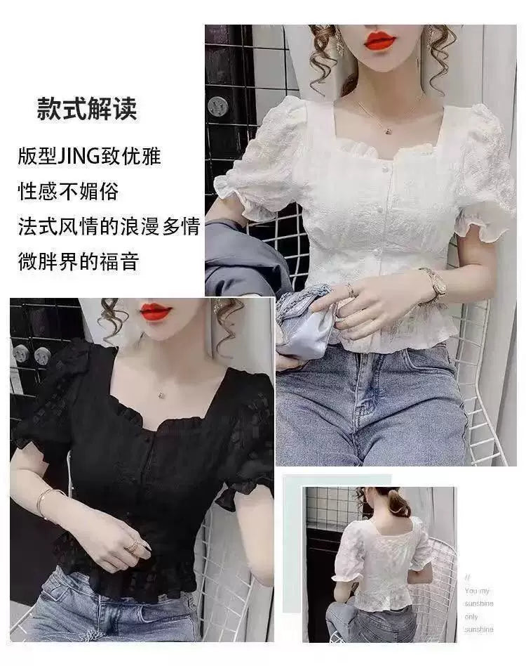 2025 Summer New Style Chic Short-Sleeved Ruffled Top with Unique Square Neck Slim Fit Chiffon Shirt for Women2025 Summer New Style Chic Short-Sleeved Ruffled Top with Unique Square Neck Slim Fit Chiffon Shirt for Women