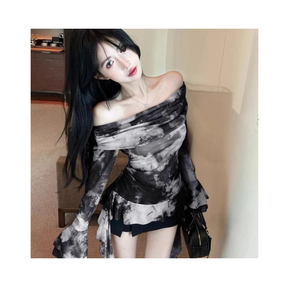 American retro design with flared sleeves and a single collar dyed mesh T shirt summer irregular ribbon sun protection top