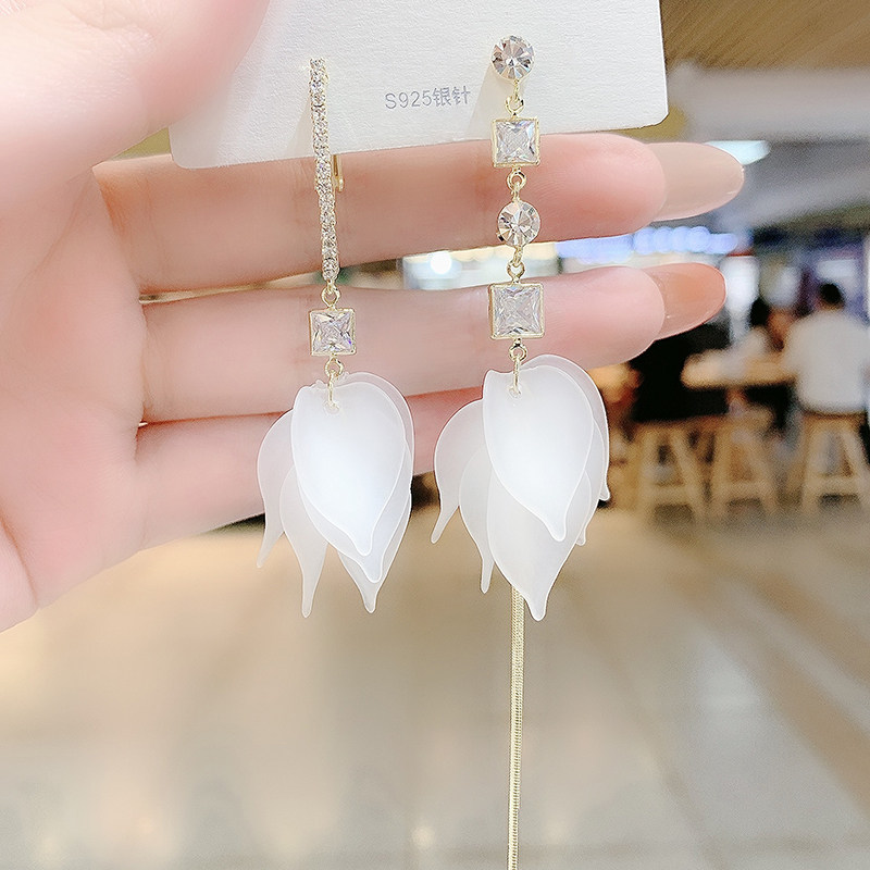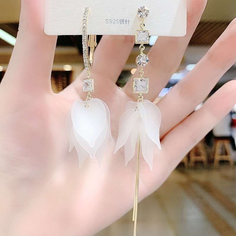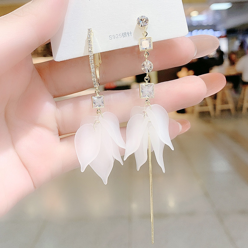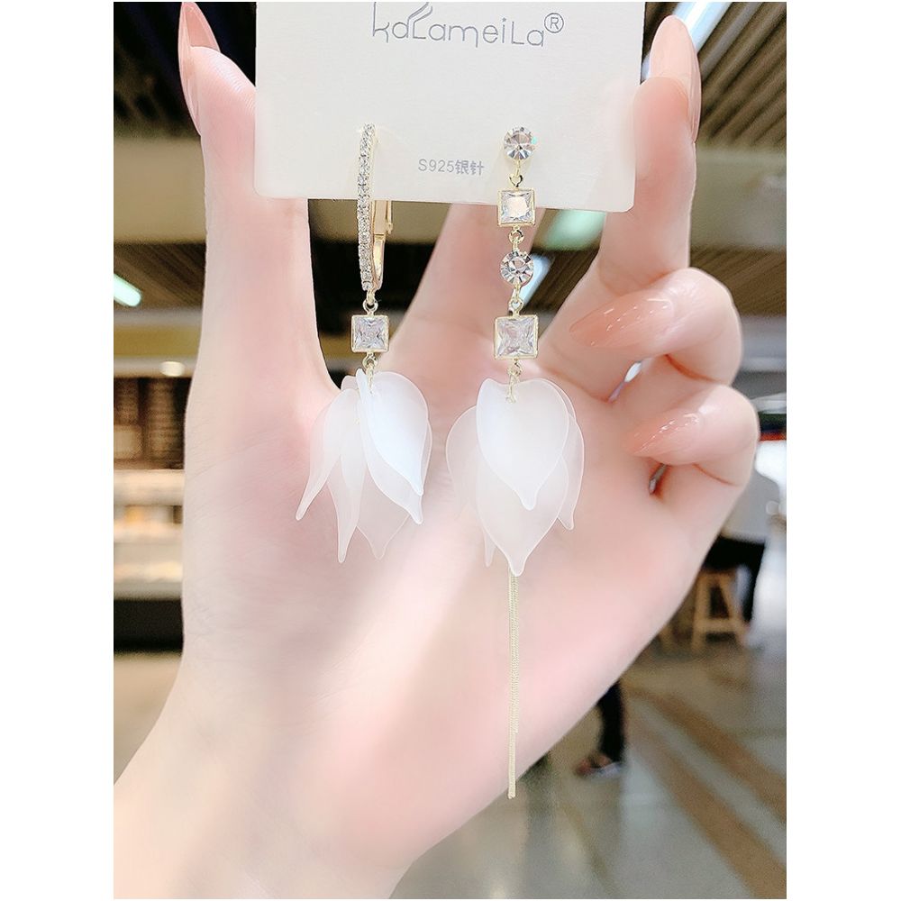 Asymmetric petal tassel earrings for women with super fairy temperament long style with diamond inlaid AB flower earrings Korean internet celebrity earrings