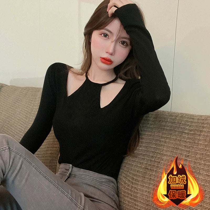 Black sexy hollow-out base layer top, autumn and winter new style, collarbone top, halter neck T-shirt, niche and unique inner layer, slim fit.Black sexy hollow-out base layer top, autumn and winter new style, collarbone top, halter neck T-shirt, niche an