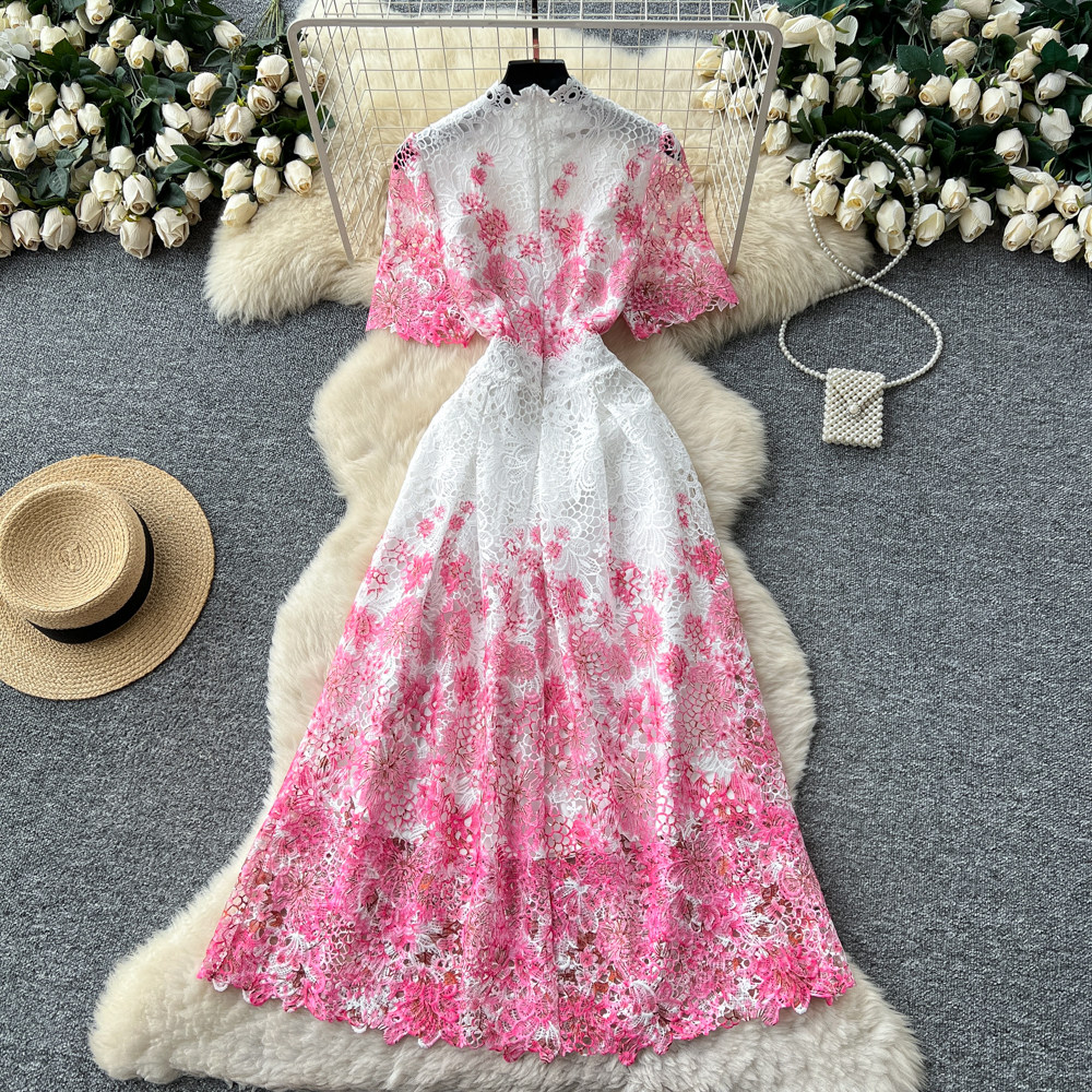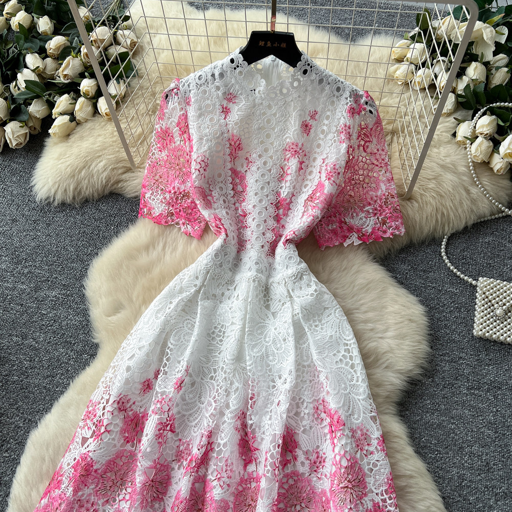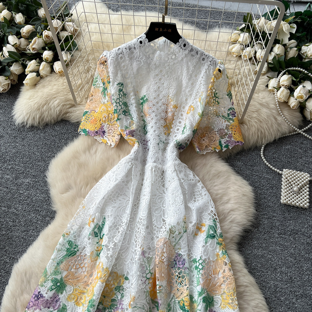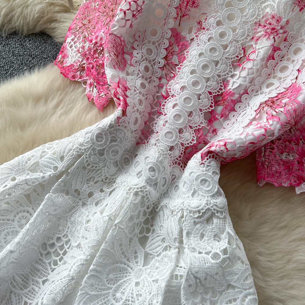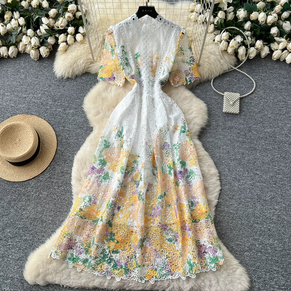 Designer Runway Summer White Flower Embroidery Evening Dress Women Short Sleeve Sexy Hollow Out Waist Long Vestidos Lace Dresses