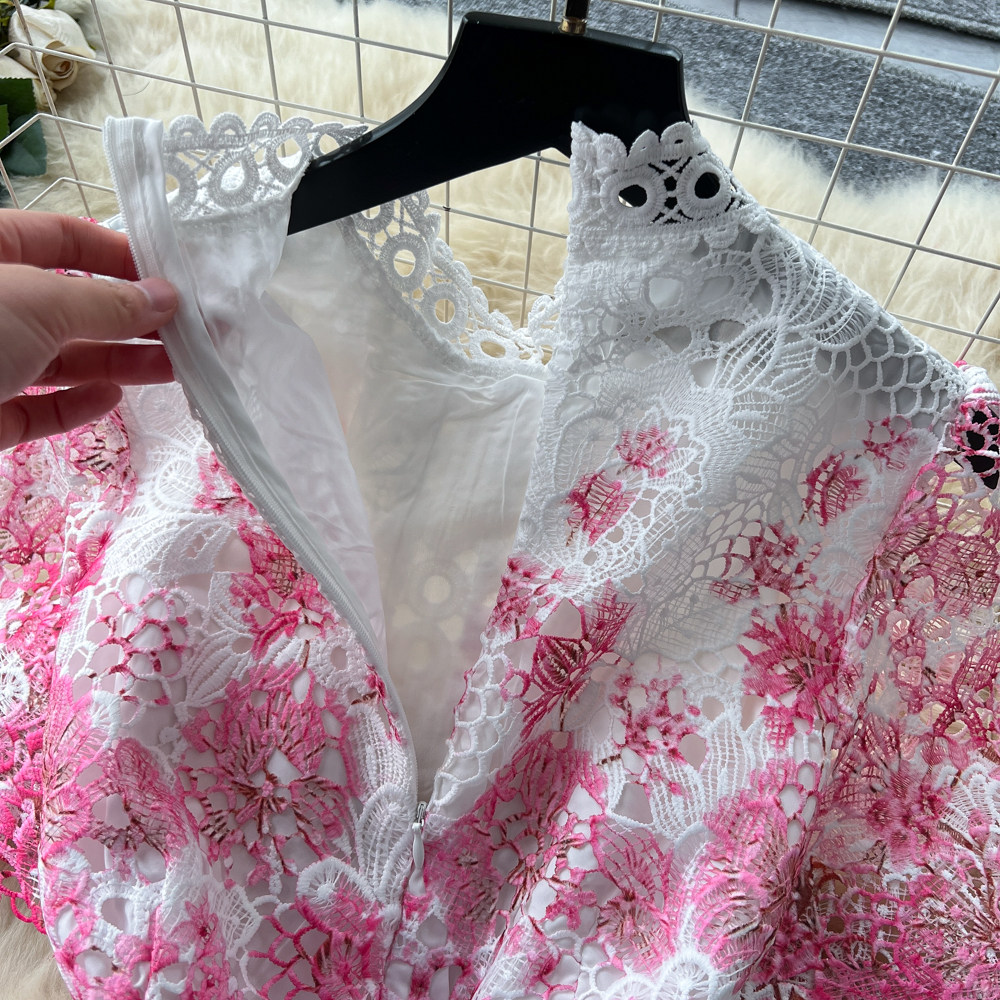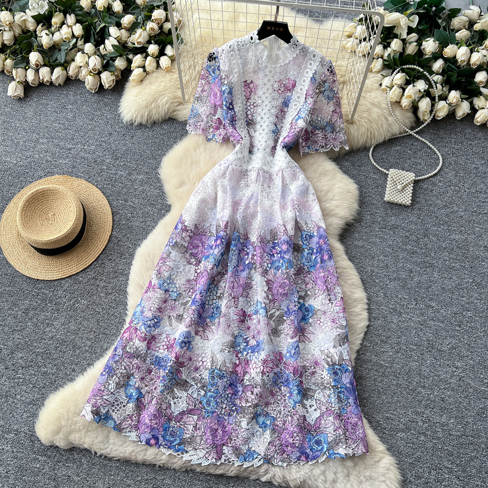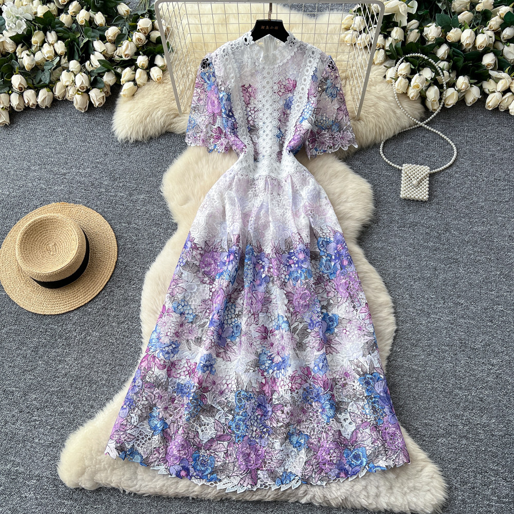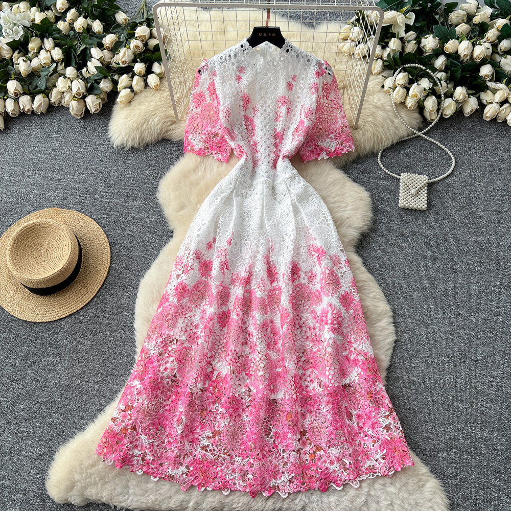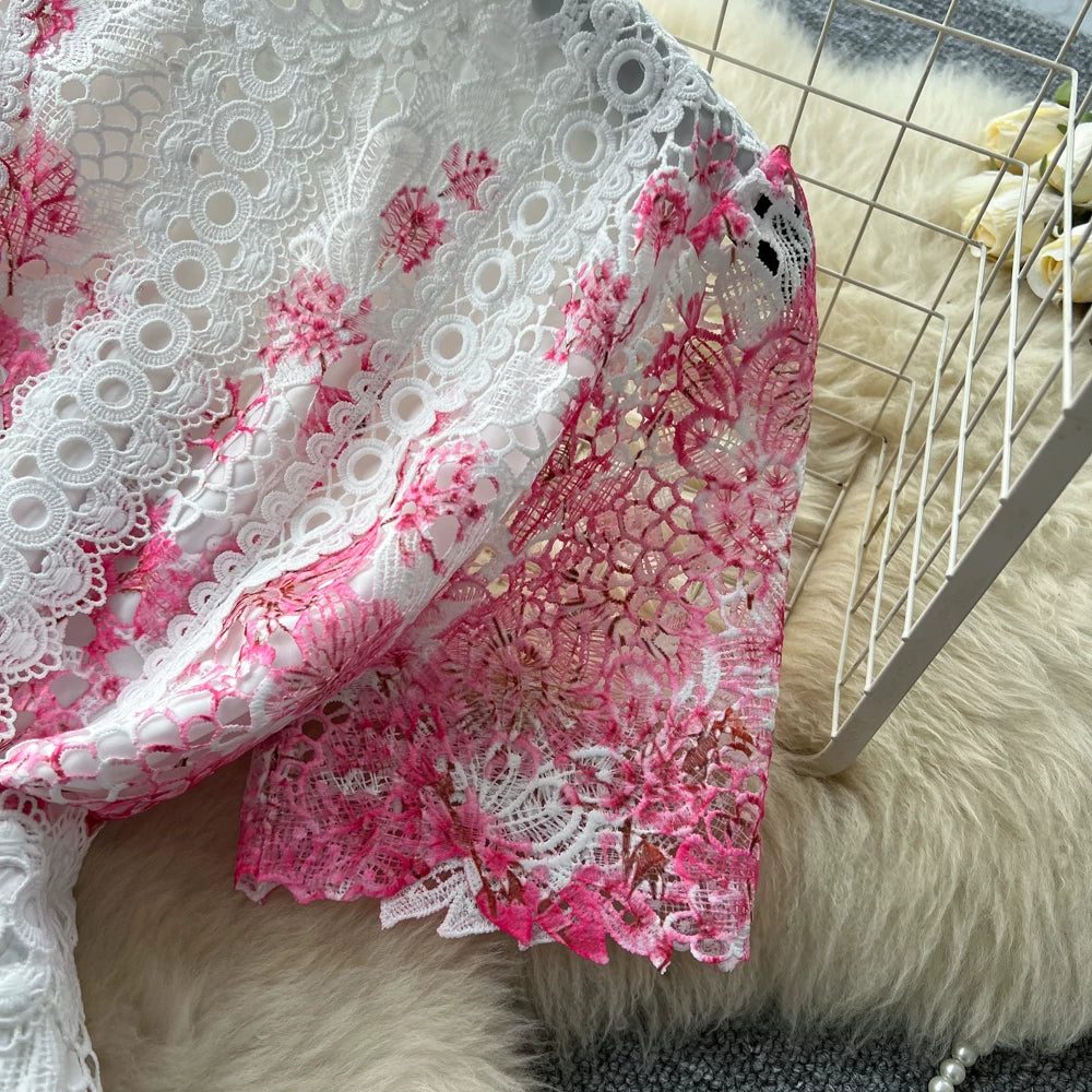 Designer Runway Summer White Flower Embroidery Evening Dress Women Short Sleeve Sexy Hollow Out Waist Long Vestidos Lace Dresses
