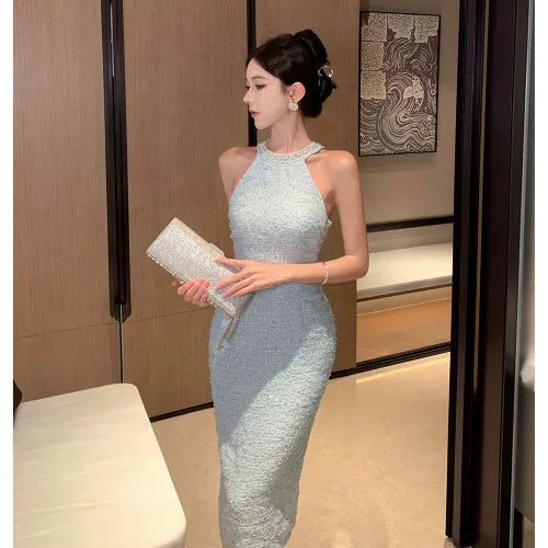 Elegant and sophisticated, this high-end little dress features a pearl halter neck, a figure-hugging design, and a cool, mature vibe.