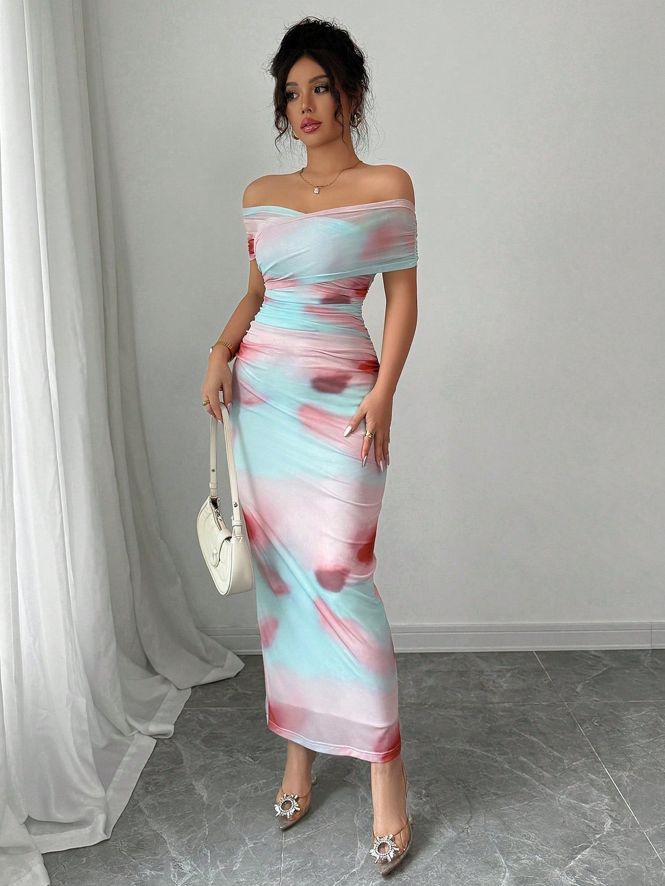 Elenzga Women's Elegant Off Shoulder Geometric Net Fabric Print Bodycon Slim Fit Pastel Dress, Spring/Summer