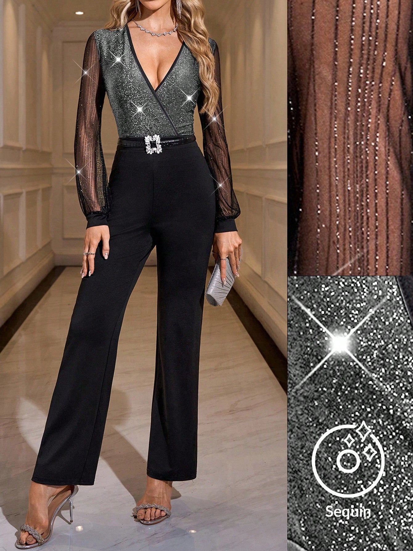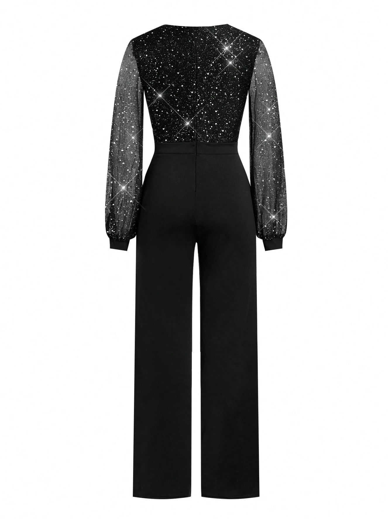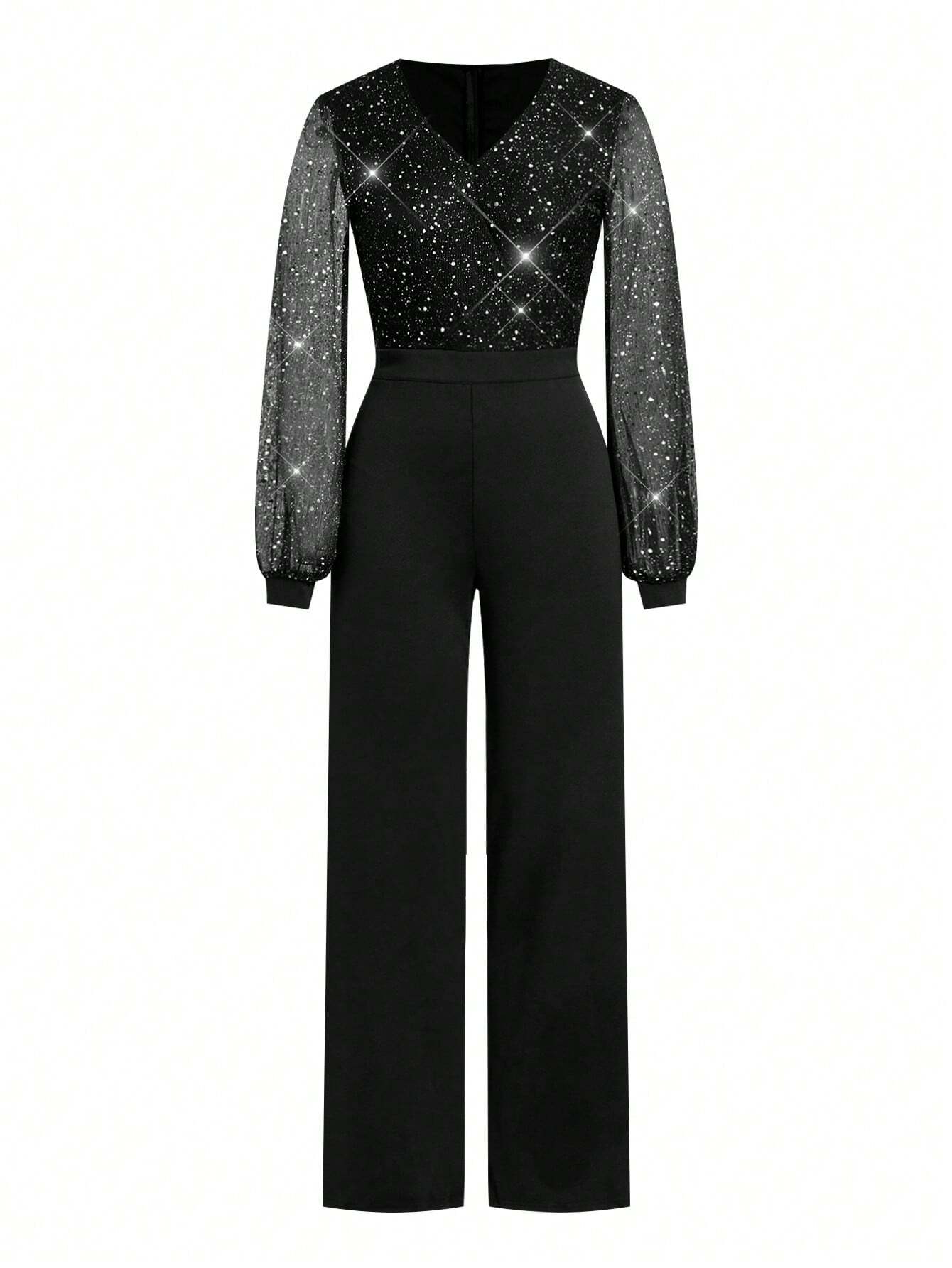 Details : Wrap, Contrast Mesh, Contrast Sequin Body : Yes Neckline : V neck Pattern Type : Plain Sleeve Type : Bishop Sleeve Style : Party Waist Line : High Waist Lined For Added Warmth : No Color : Black Type : Unitard Sleeve Length : Long Sleeve Fit Type : Regular Fit Length : Long Fabric Elasticity : Slight Stretch Material : Knitted Fabric Composition : 95% Polyester, 5% Elastane Care Instructions : Machine wash or professional dry clean Sheer : No