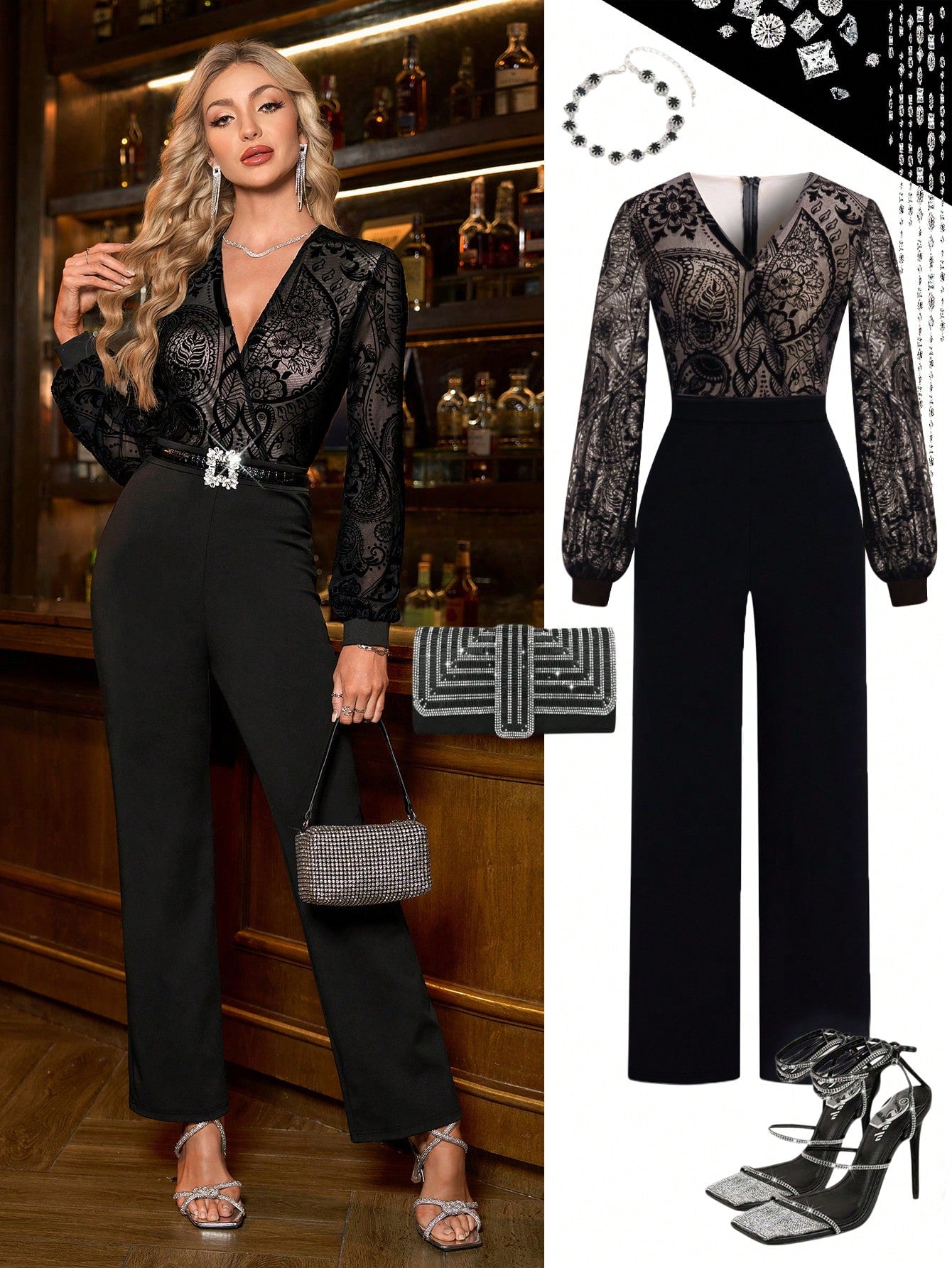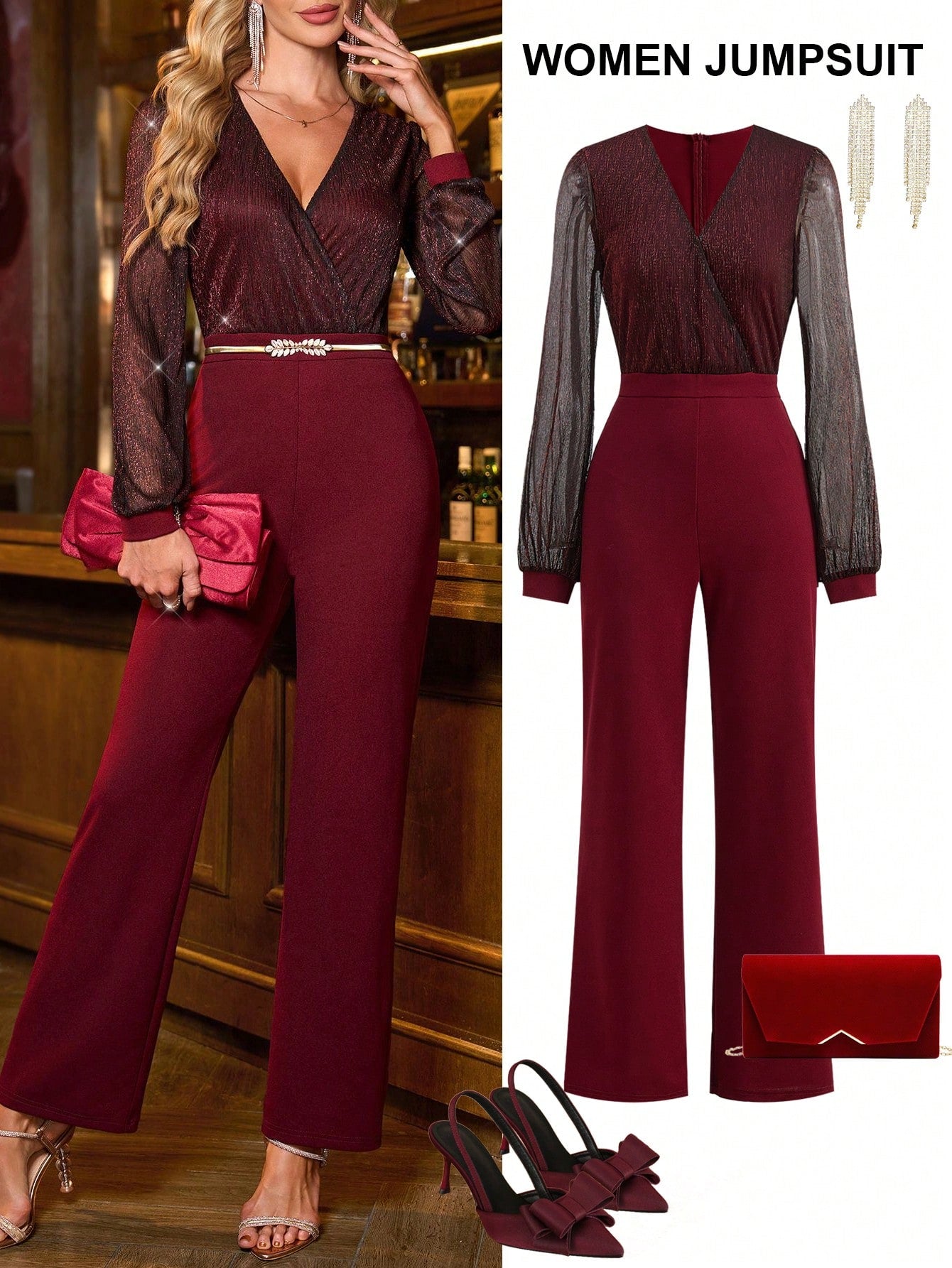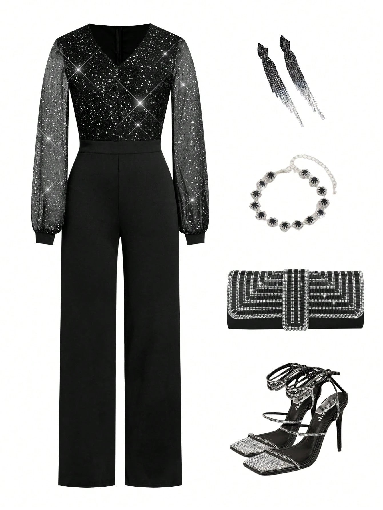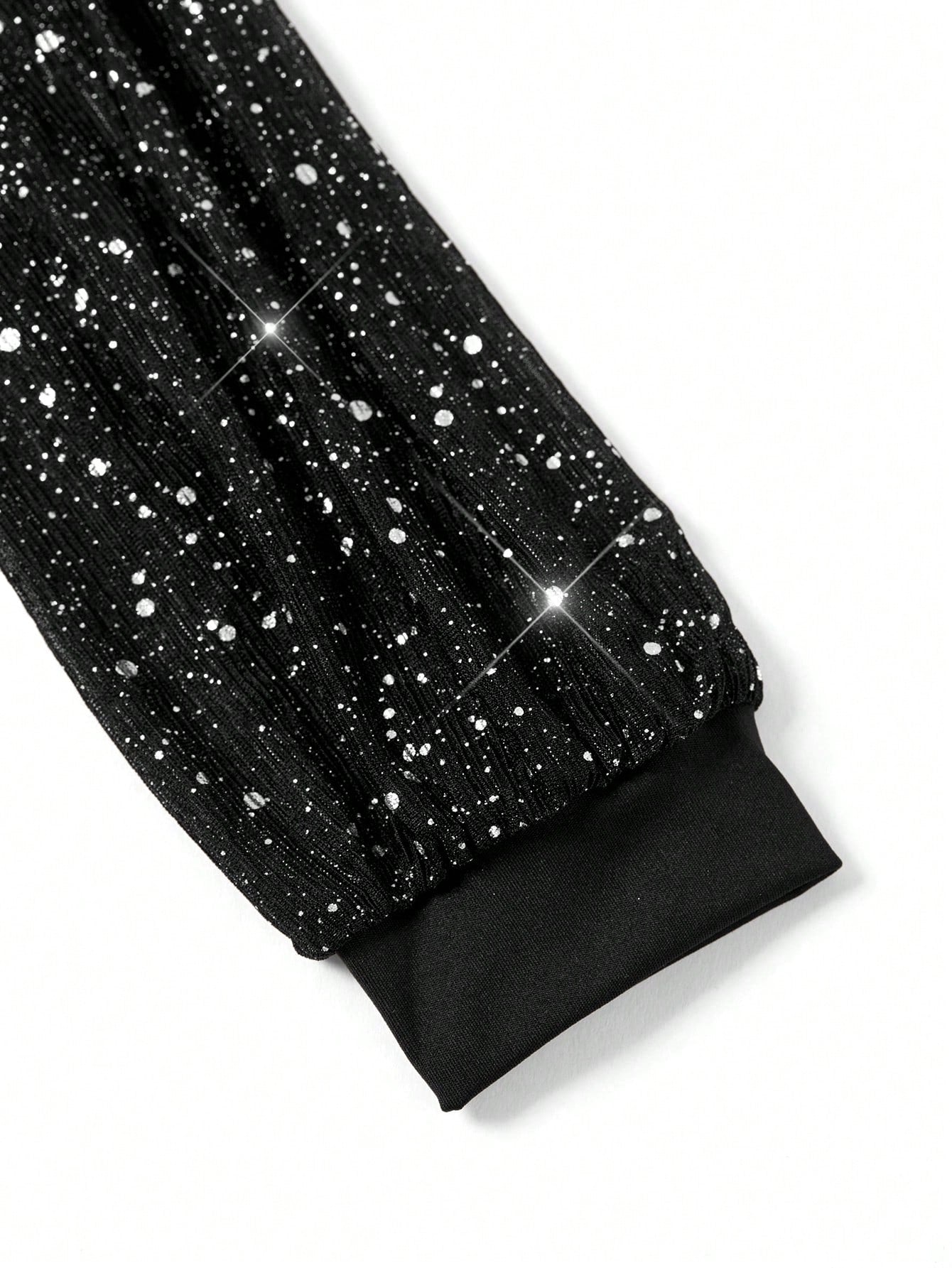 Details : Wrap, Contrast Mesh, Contrast Sequin Body : Yes Neckline : V neck Pattern Type : Plain Sleeve Type : Bishop Sleeve Style : Party Waist Line : High Waist Lined For Added Warmth : No Color : Black Type : Unitard Sleeve Length : Long Sleeve Fit Type : Regular Fit Length : Long Fabric Elasticity : Slight Stretch Material : Knitted Fabric Composition : 95% Polyester, 5% Elastane Care Instructions : Machine wash or professional dry clean Sheer : No
