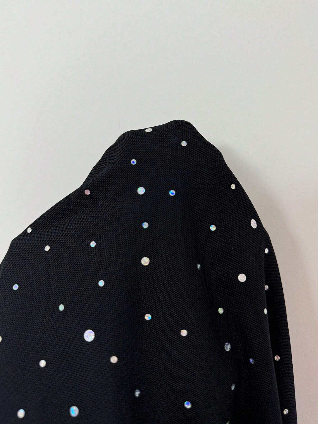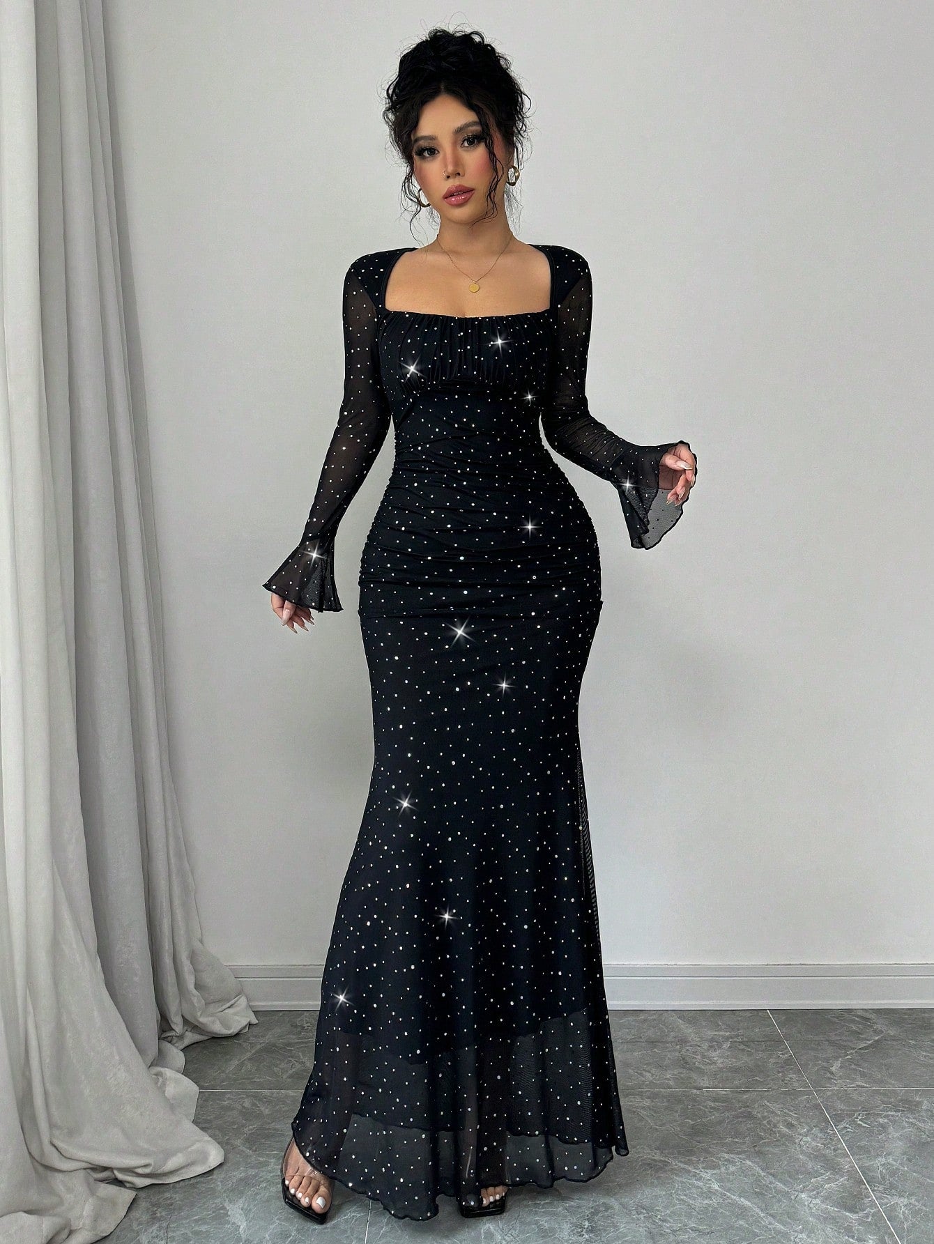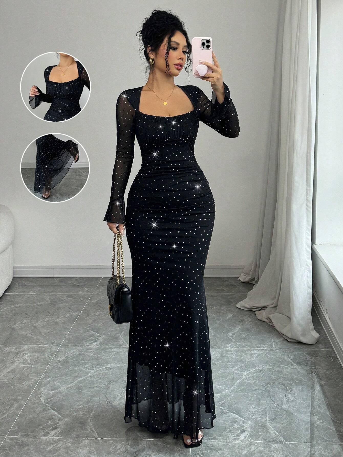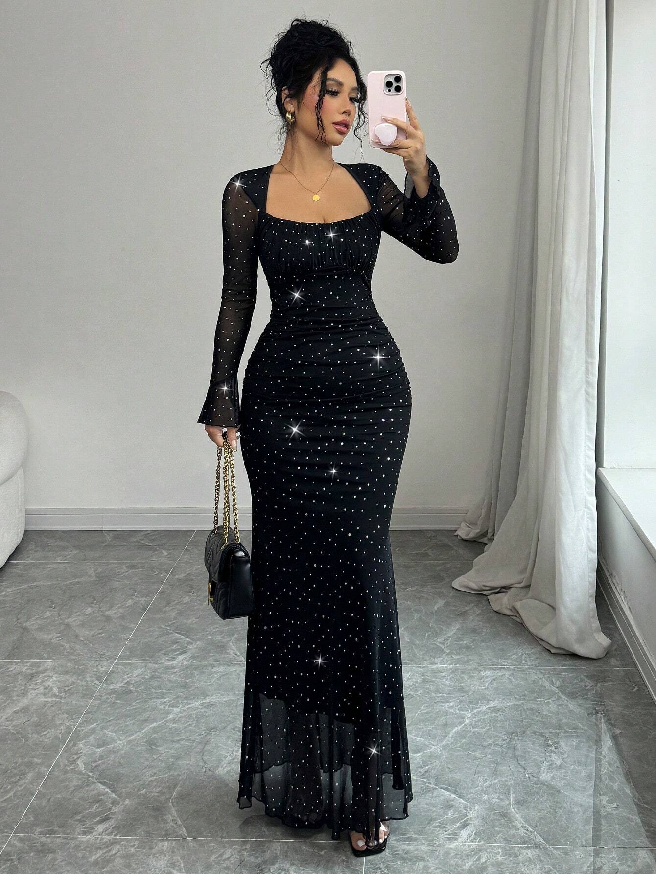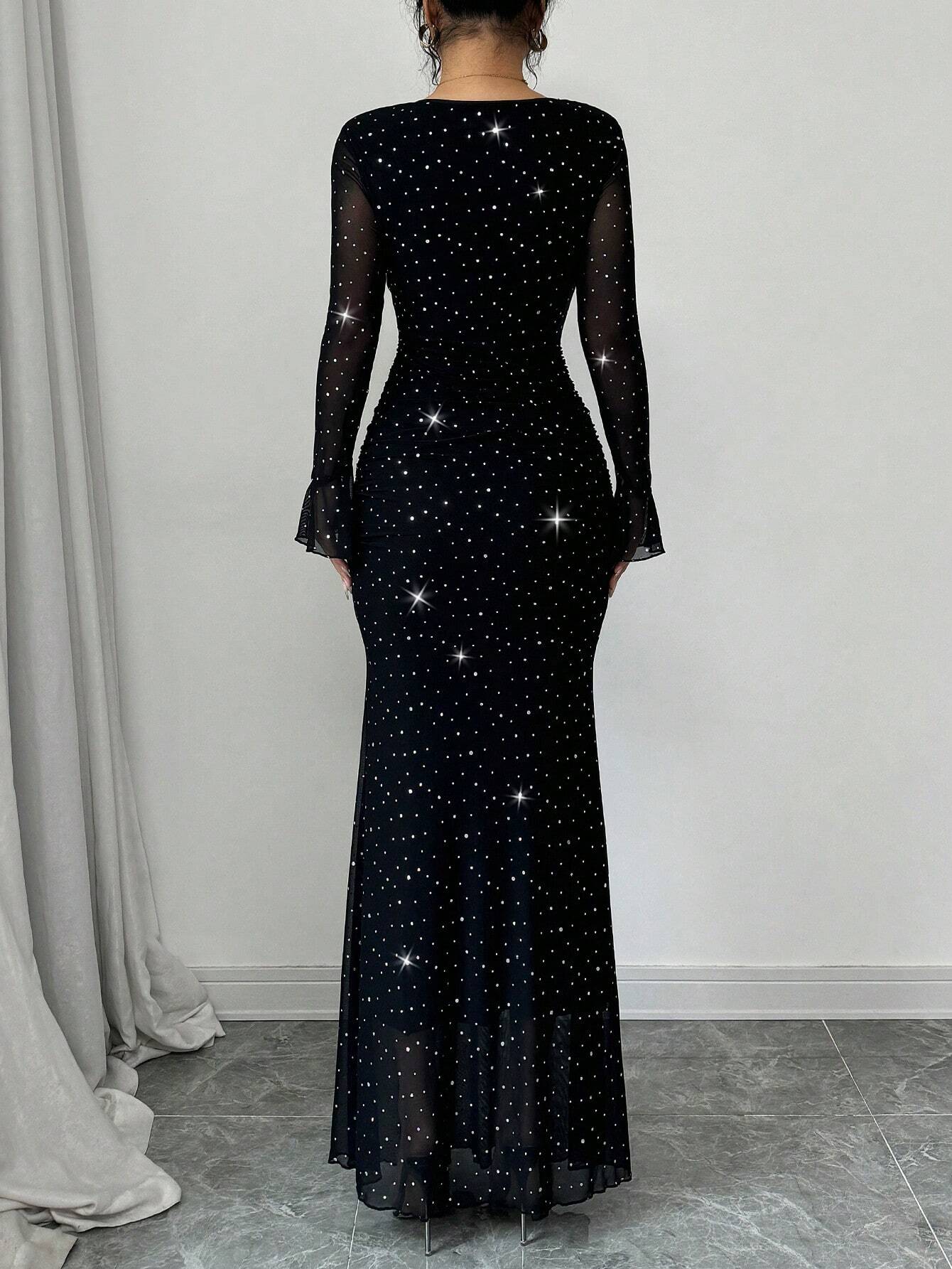 EU/UK WarehouseRafferiza Elegant Party Asymmetric Neck Pleated Front & Side Bodycon Mermaid Hem Long Sleeve Flare Cuff Dress For Women In Black, Autumn/Winter, Jacquard Knit Mesh Fabric With Silver Foil Maxi Women Outfit Fall Cloth For Women