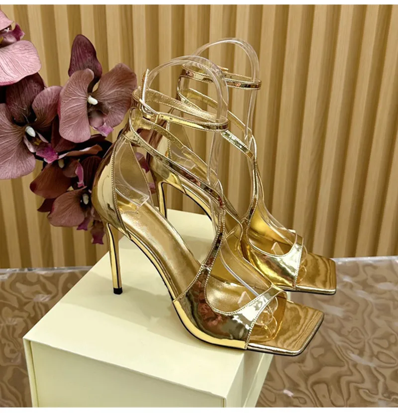 Fashion Patent Leather Peep toe Women Gladiator Sandals Sexy Narrow band Ankle Strap Gold Stiletto High heels Summer Party Shoes