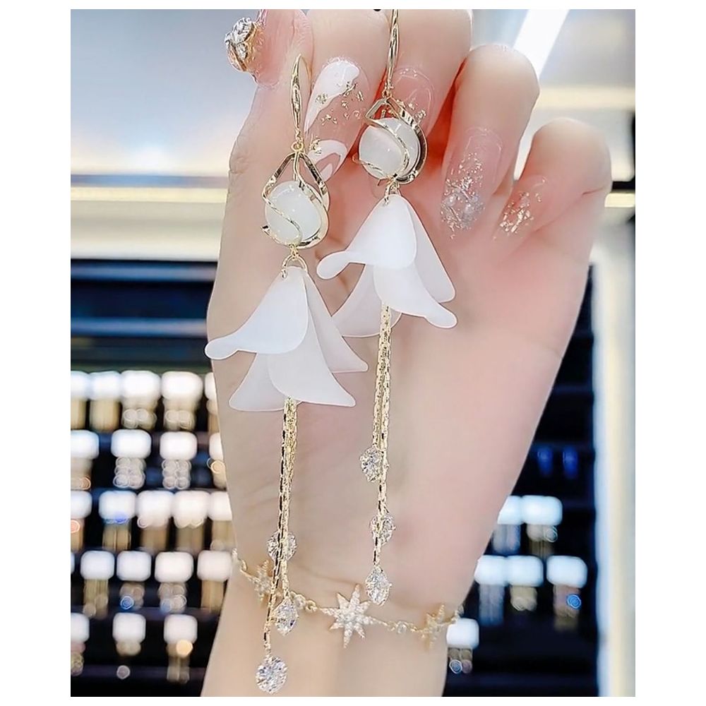 Flower white dress cat eye stone elegant earrings tassel long style 2024 new explosive anti allergic earrings