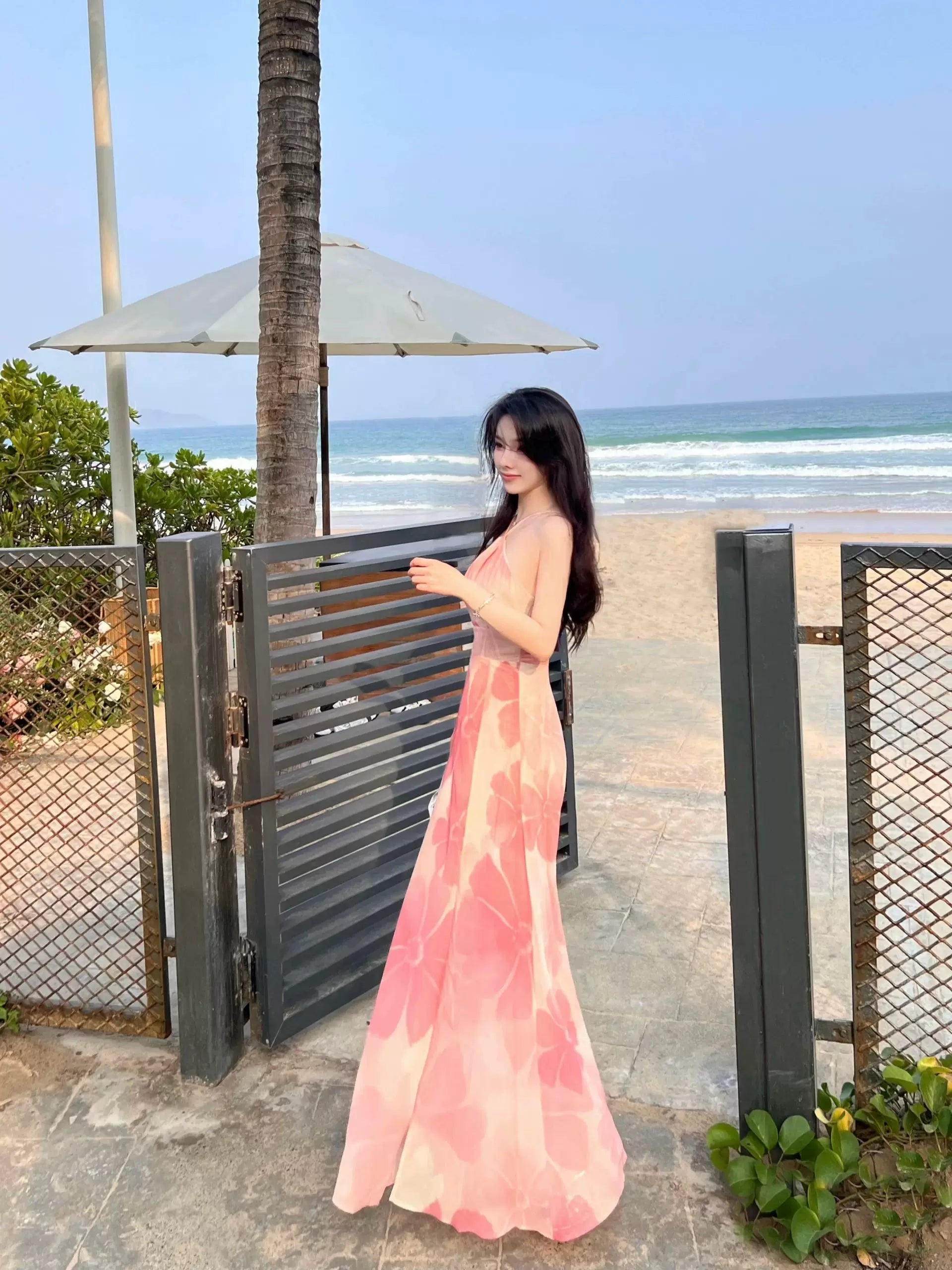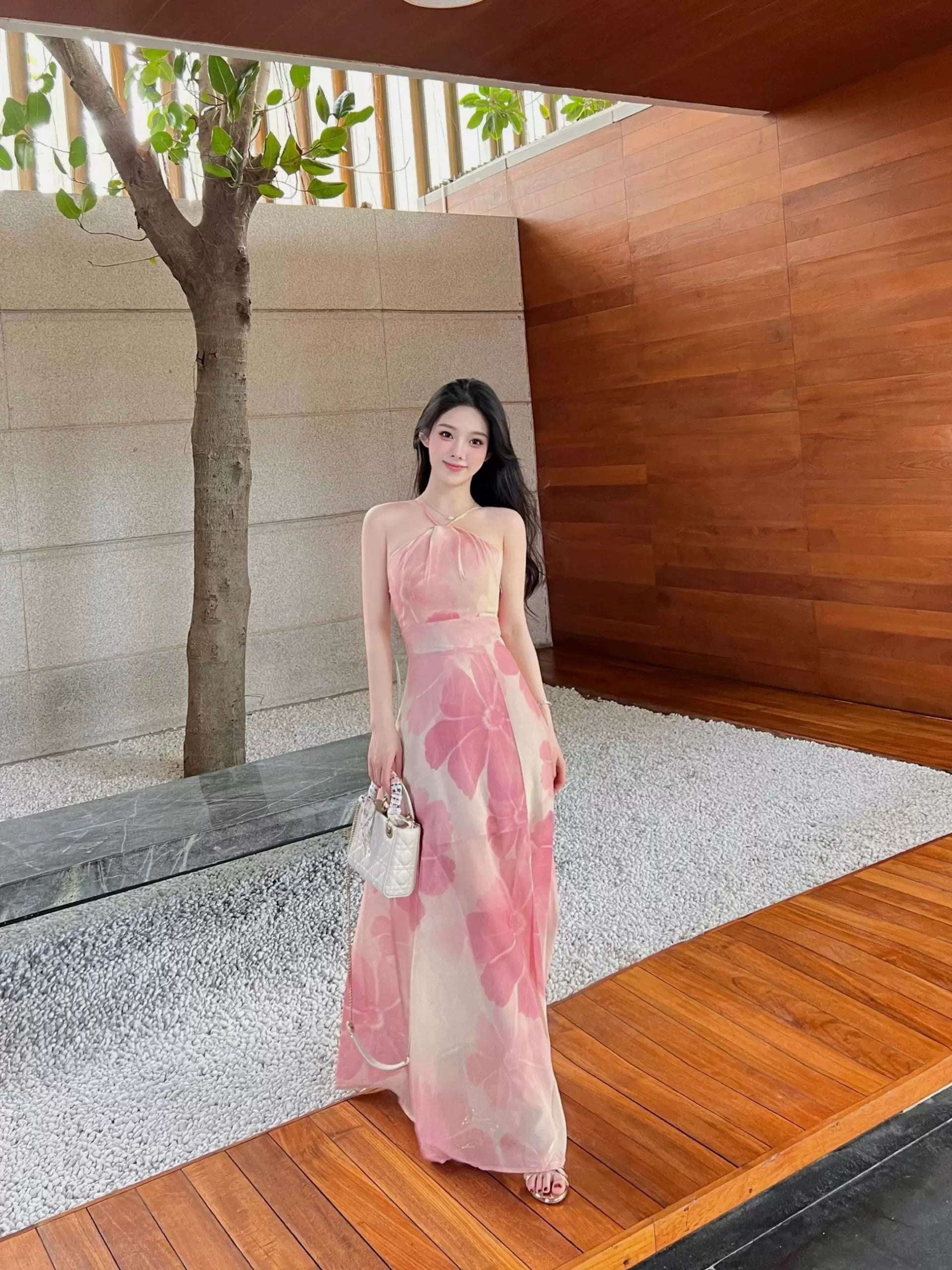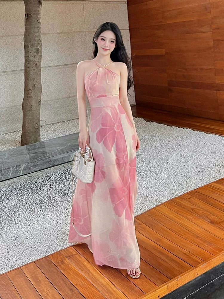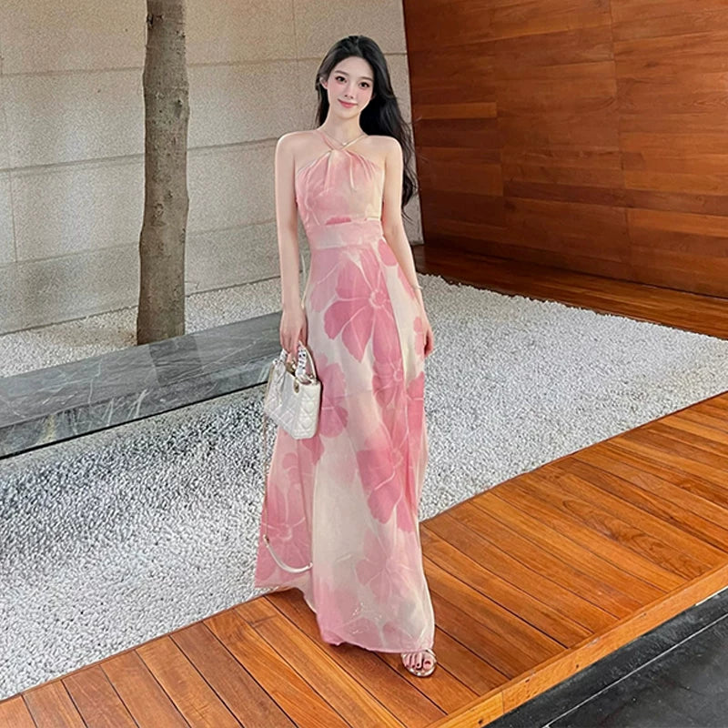 French-style floral halter neck dress, new summer travel style, long dress, off-shoulder, beach vacation dress, fairy-like.French-style floral halter neck dress, new summer travel style, long dress, off-shoulder, beach vacation dress, fairy-like.