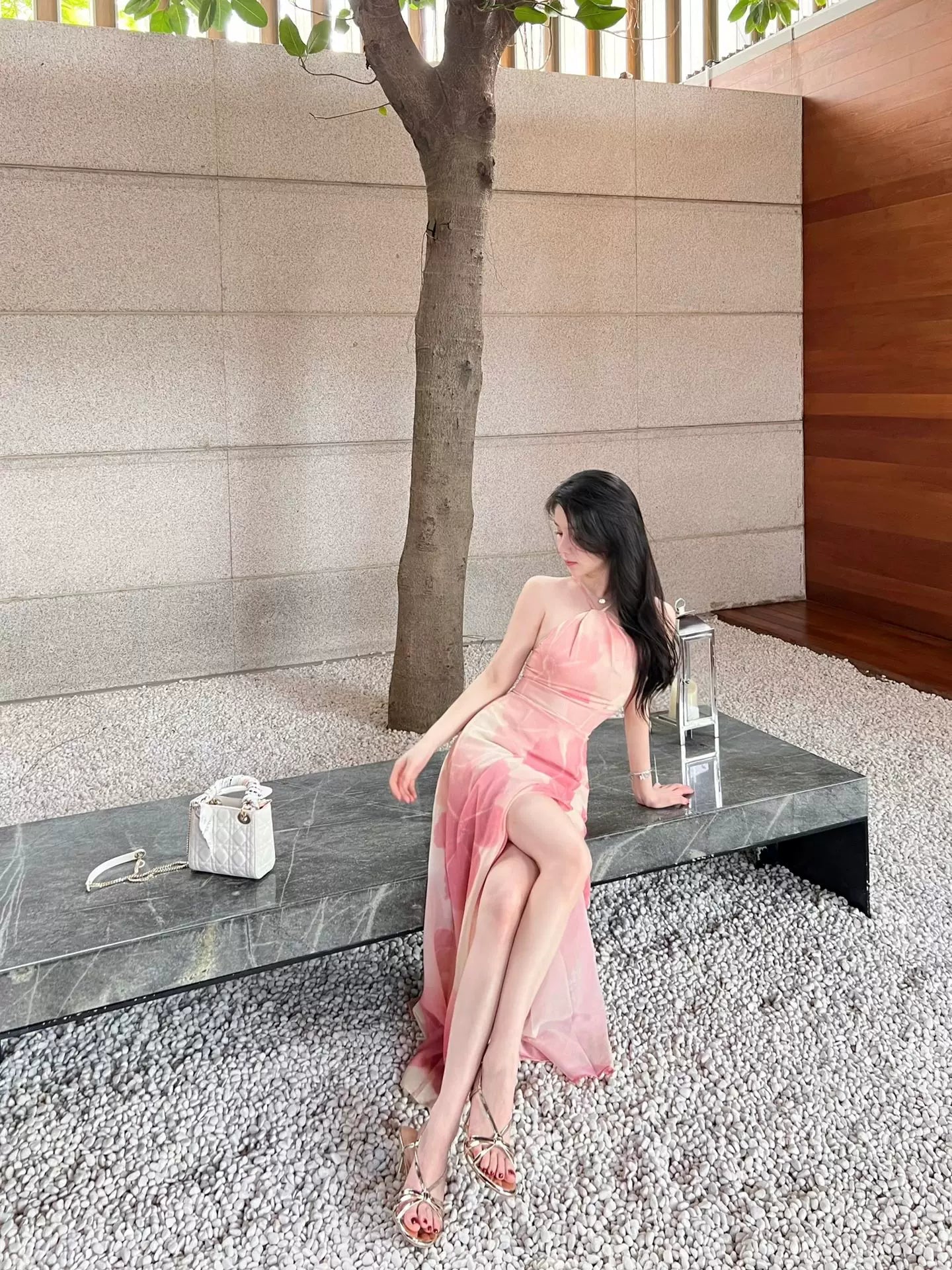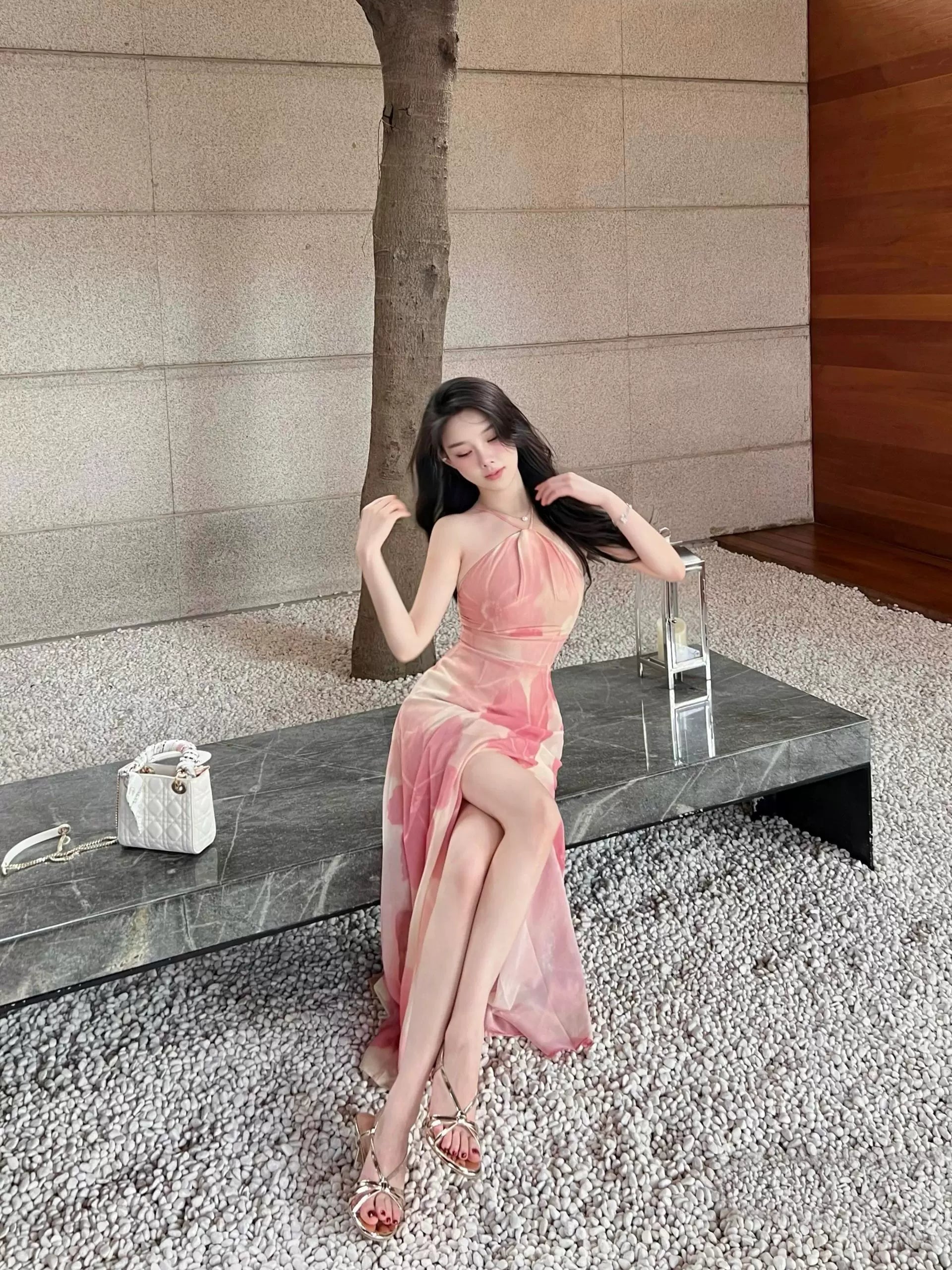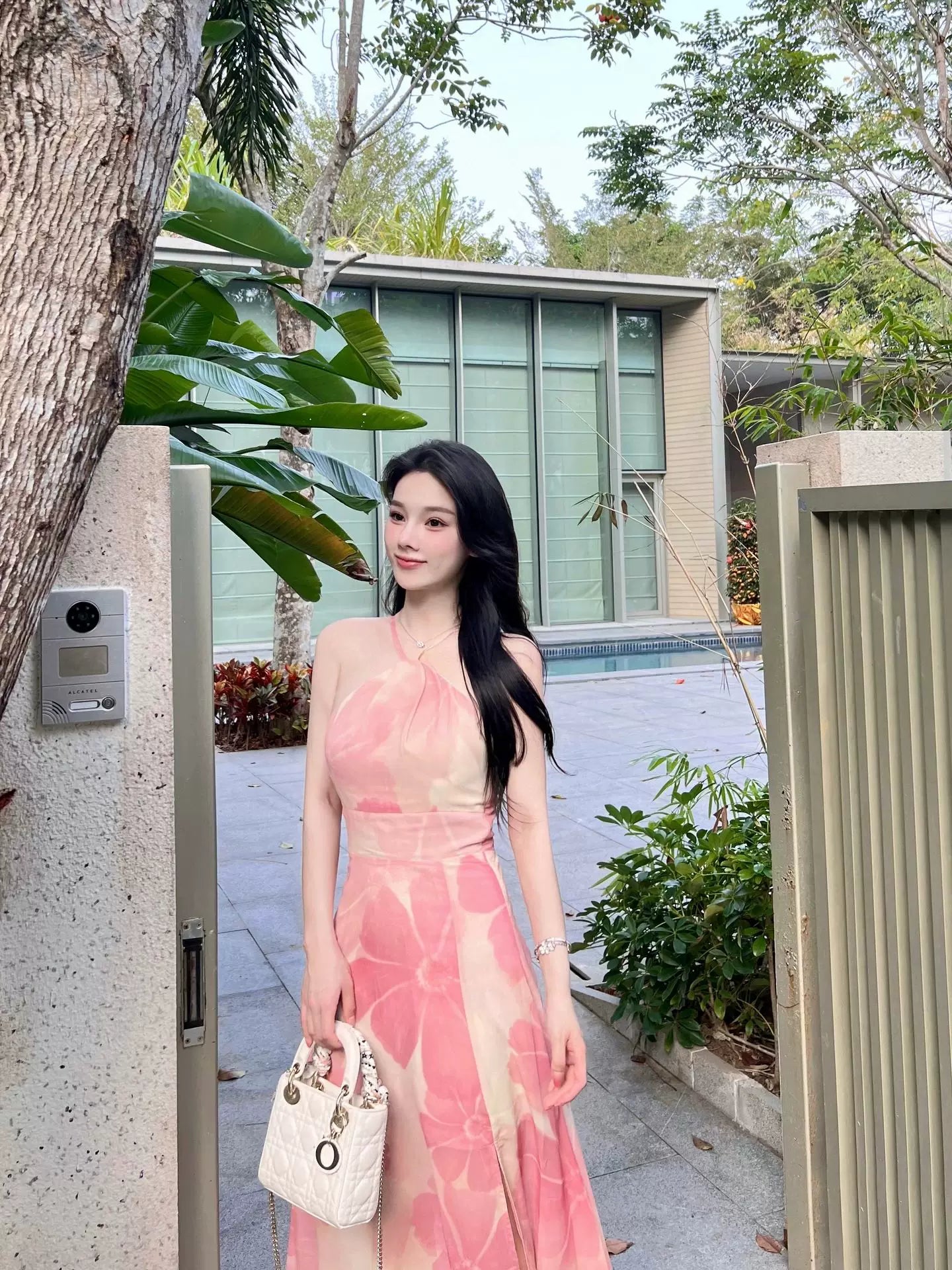 French-style floral halter neck dress, new summer travel style, long dress, off-shoulder, beach vacation dress, fairy-like.French-style floral halter neck dress, new summer travel style, long dress, off-shoulder, beach vacation dress, fairy-like.