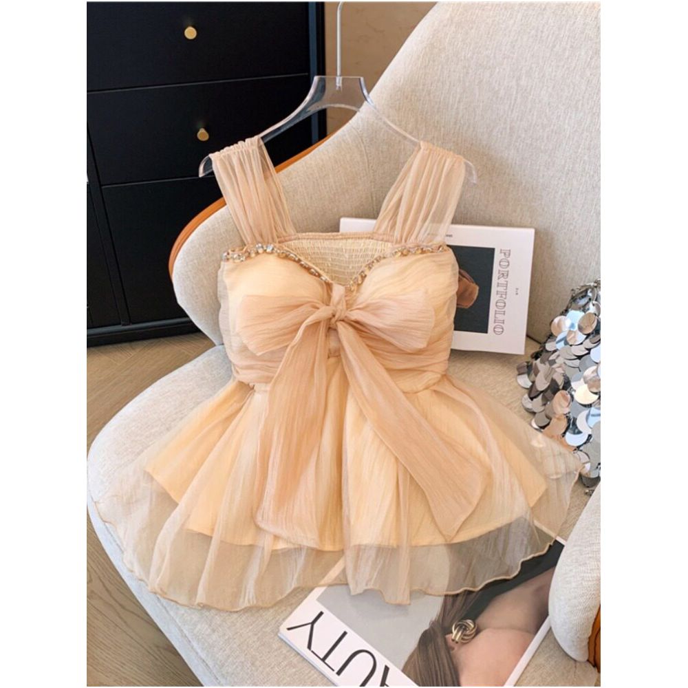 French style heavy duty rhinestone embellished chiffon camisole for women summer style sweet bow padded bra sleeveless skirt top