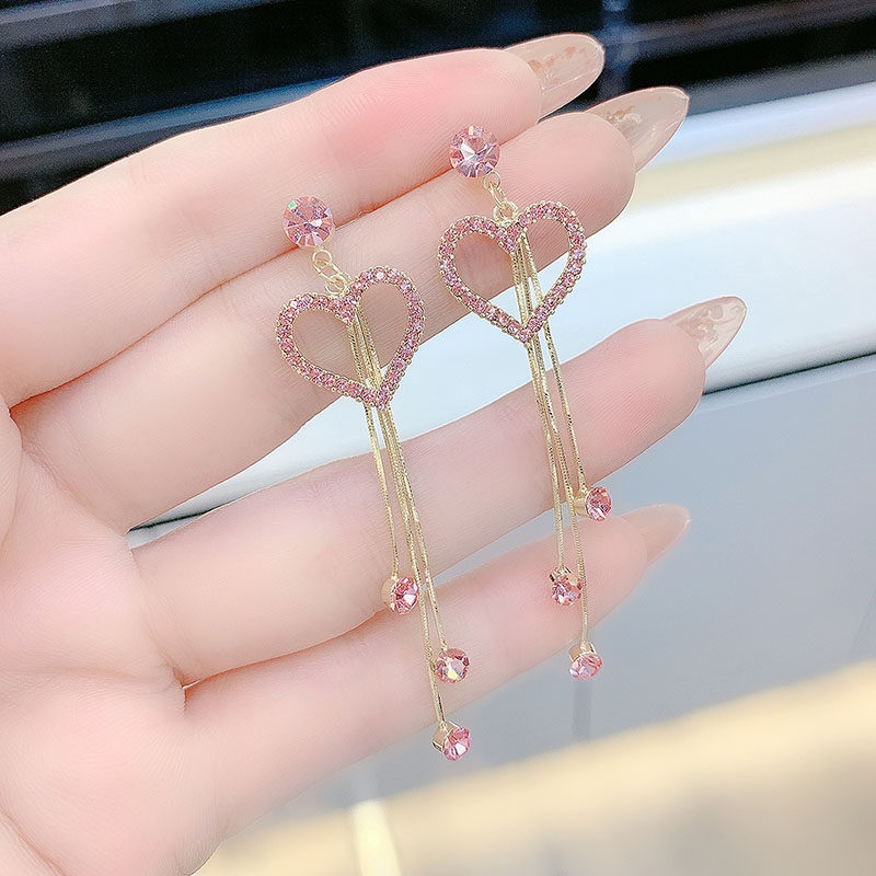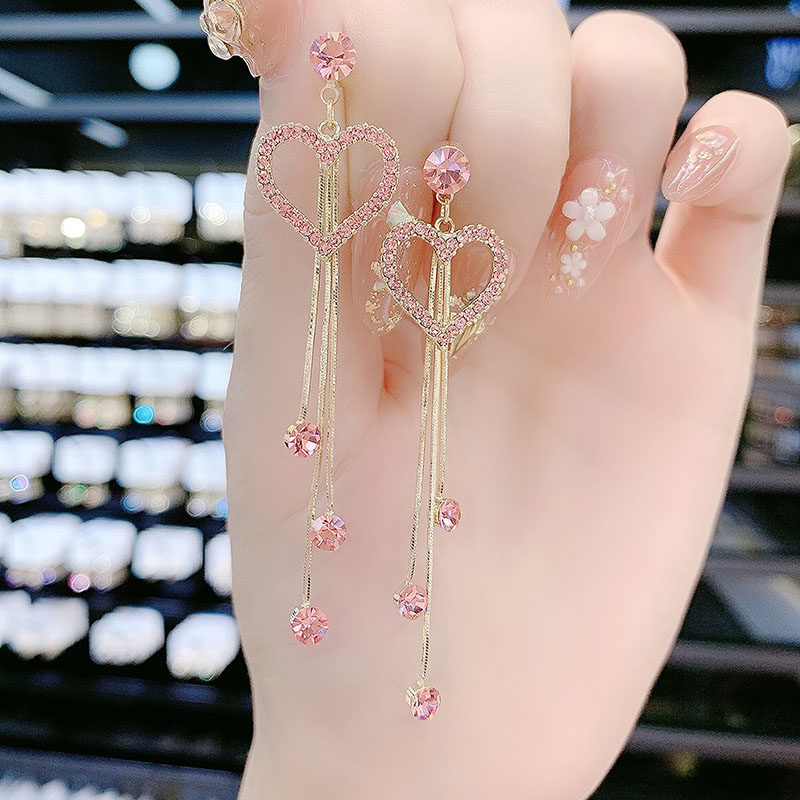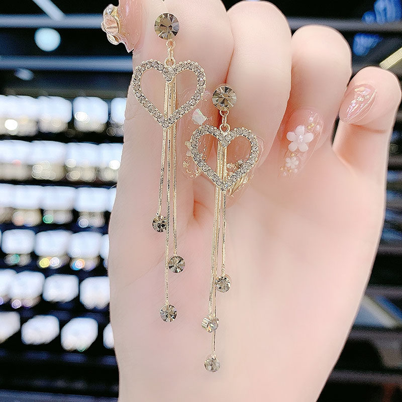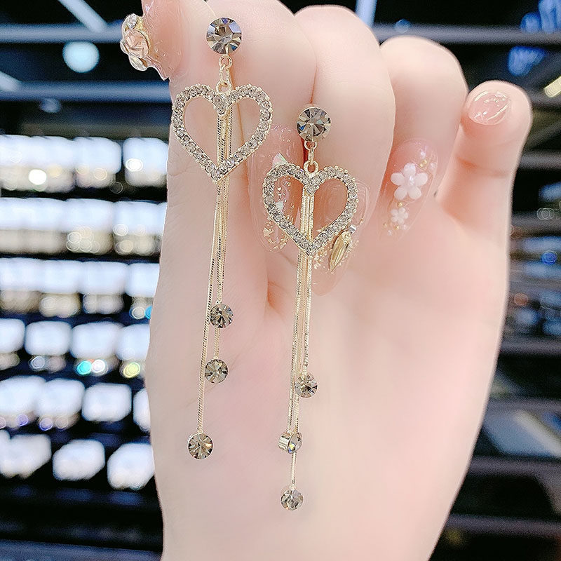 High end fashion diamond studded heart shaped tassel earrings earrings with temperament long heart shaped earrings super sparkling internet famous earrings for women