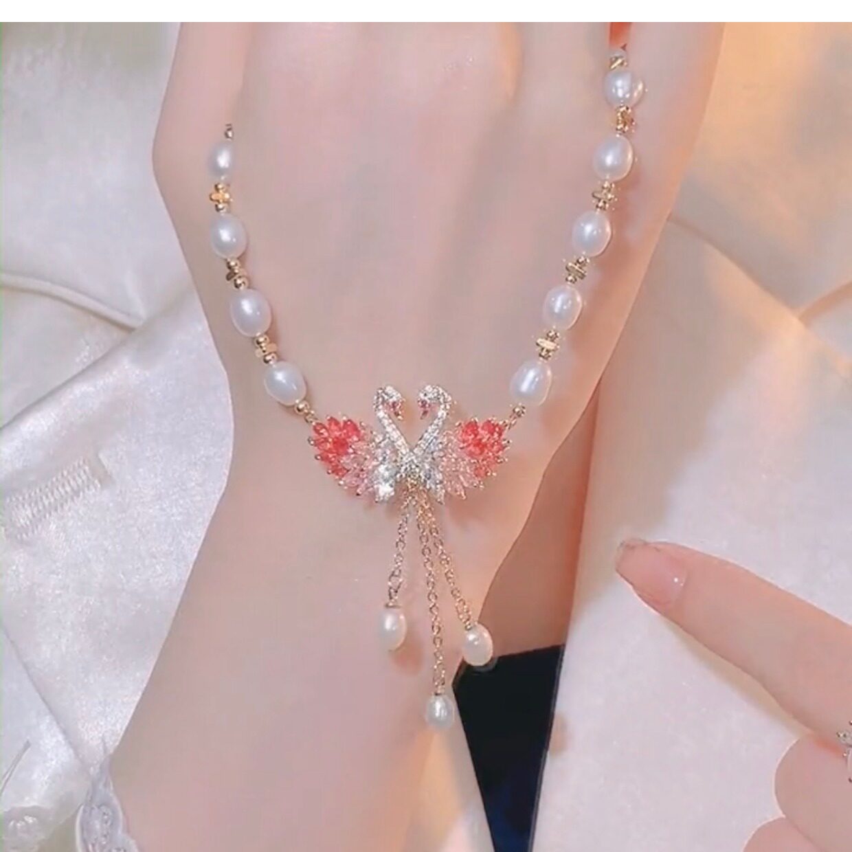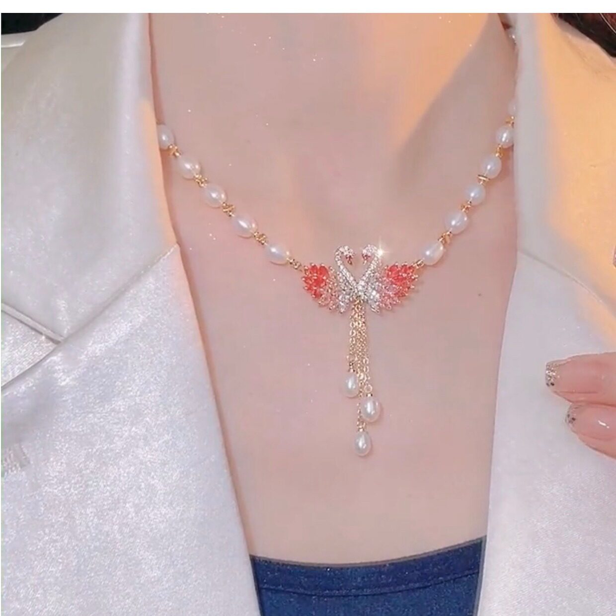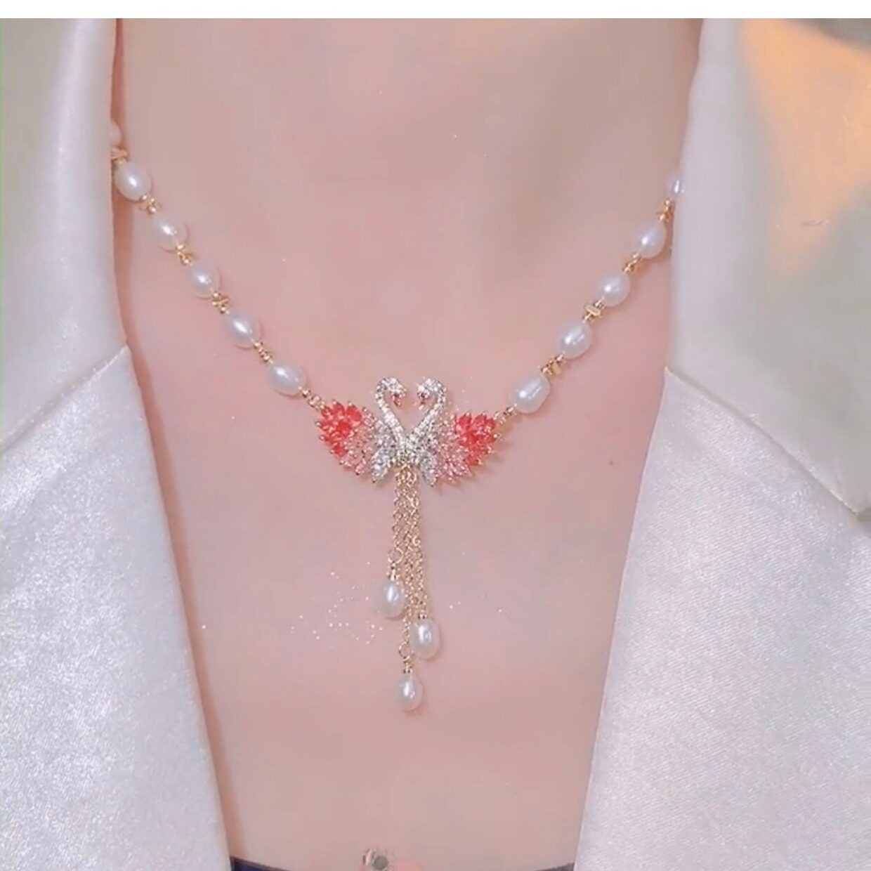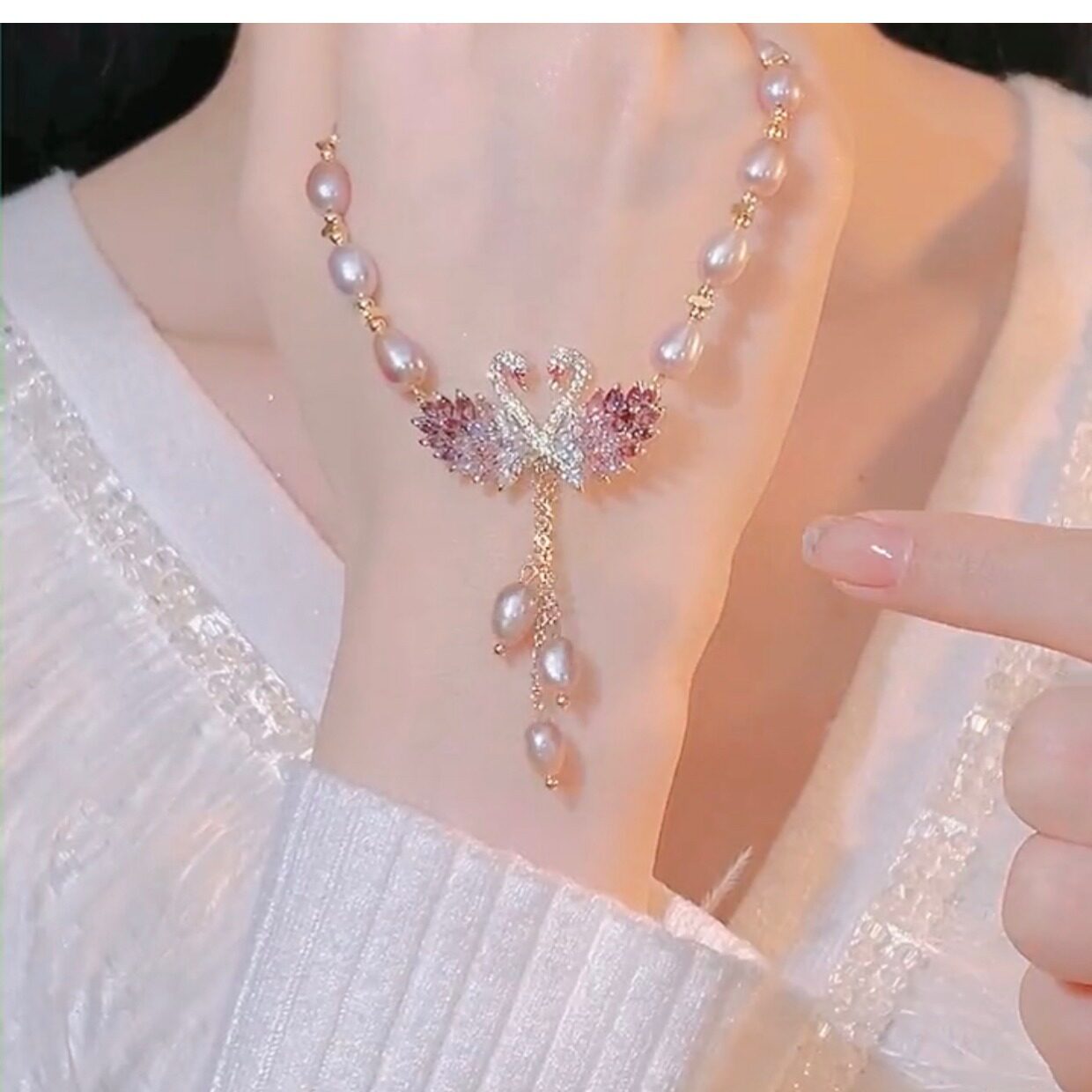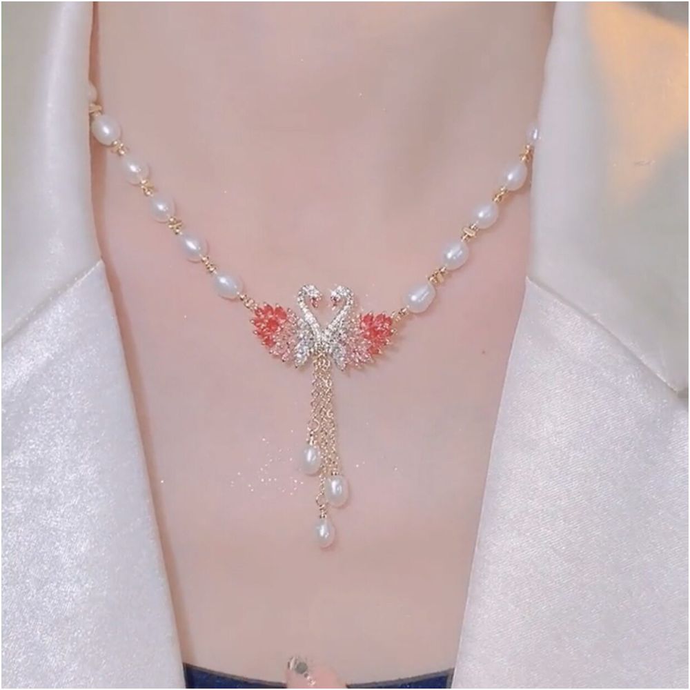 Japanese and Korean style 2026 new swan pink pearl necklace women s high end design fashionable cheongsam sweater chain