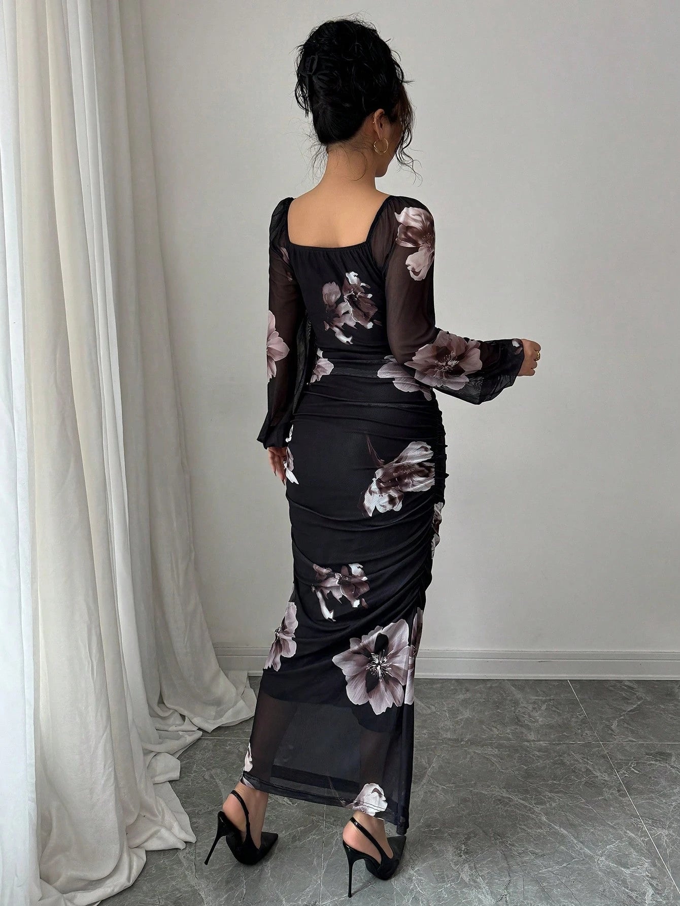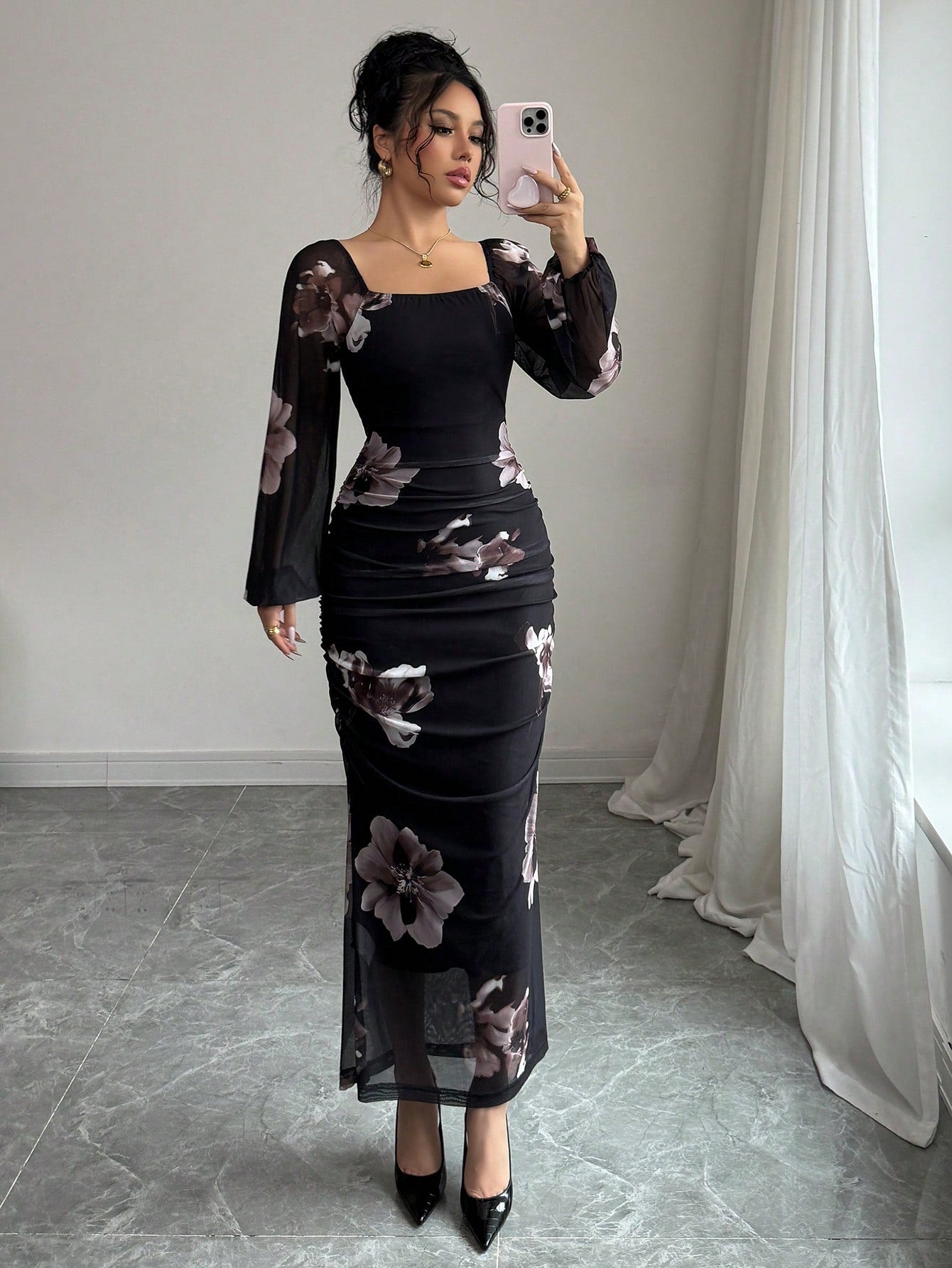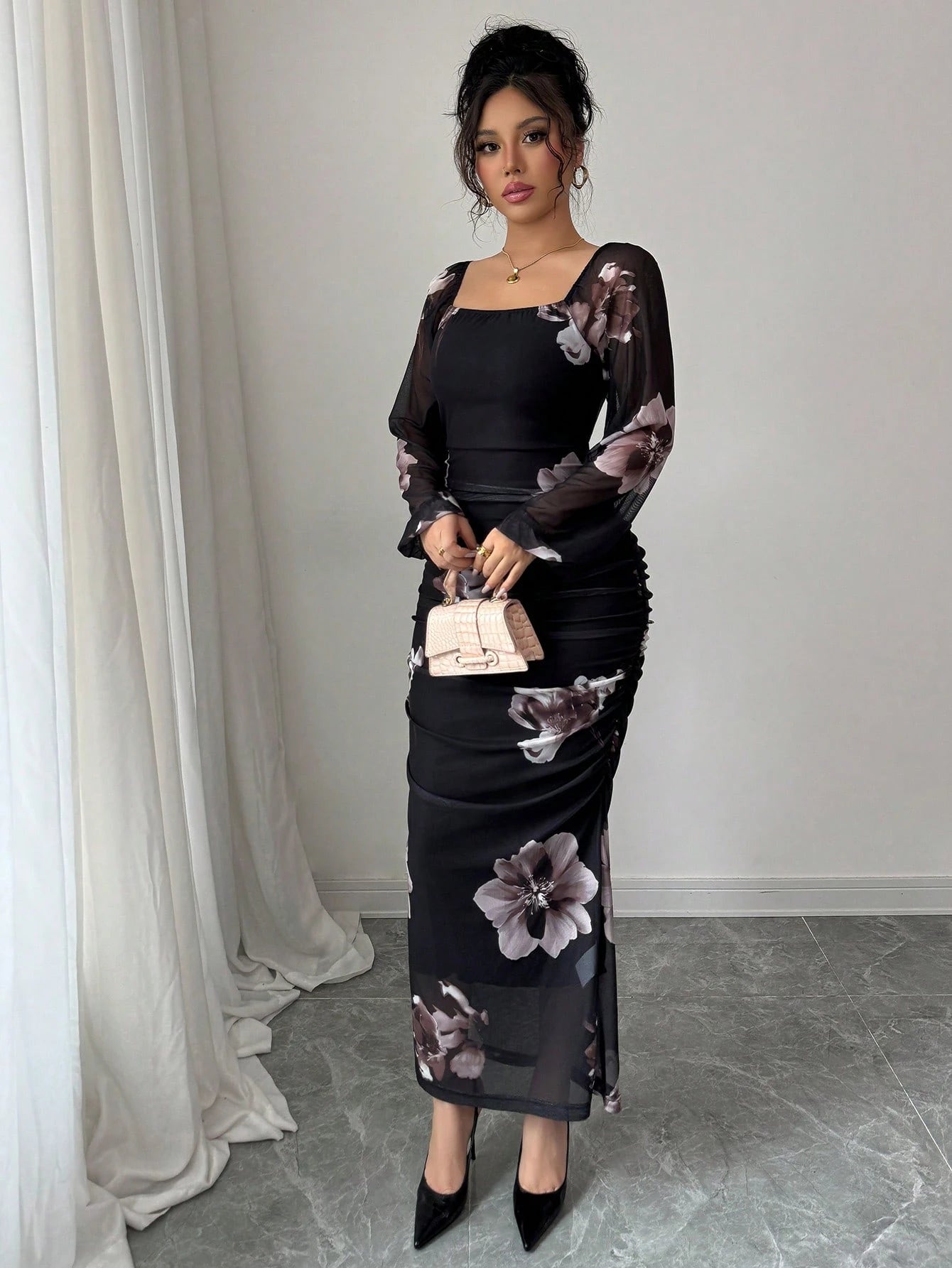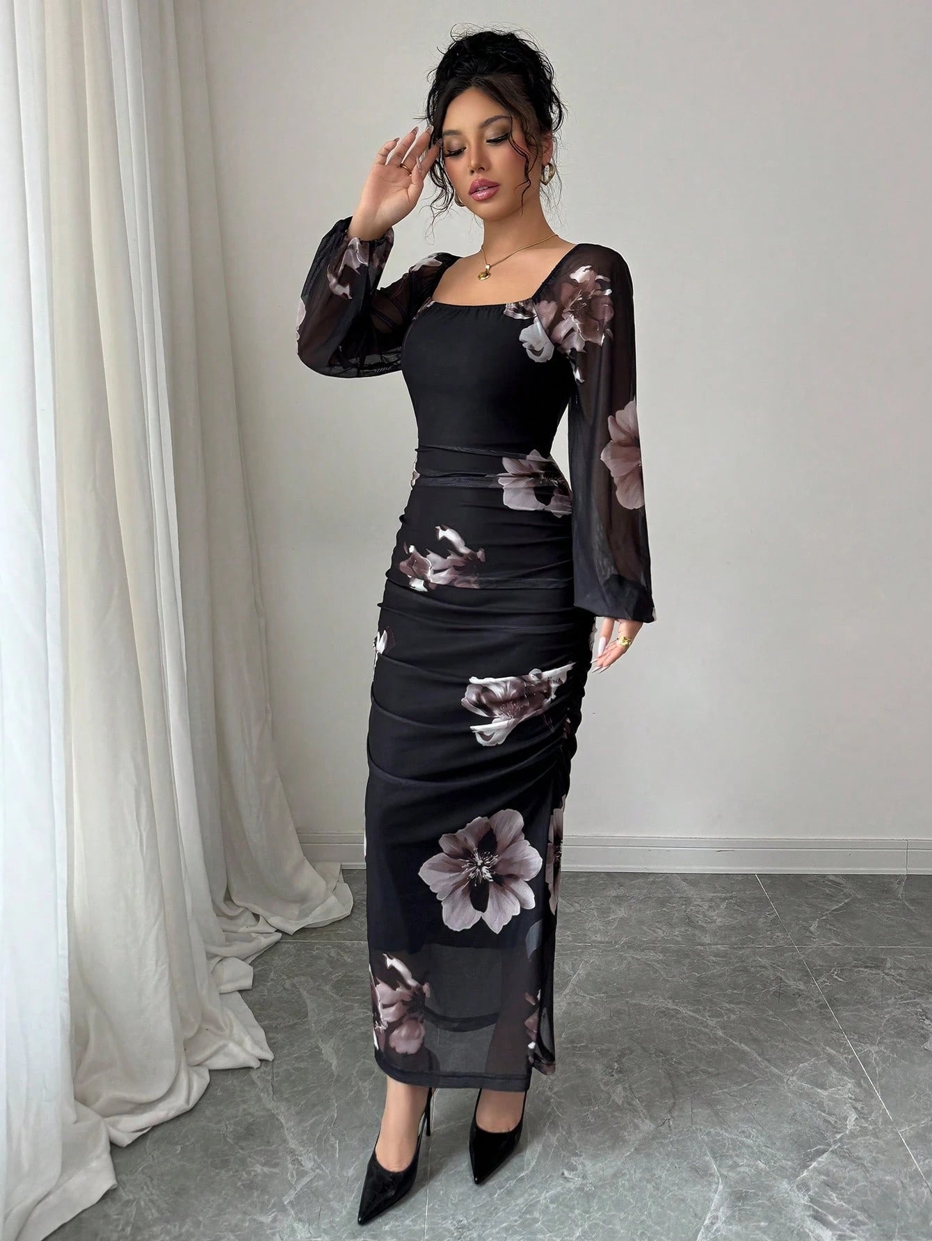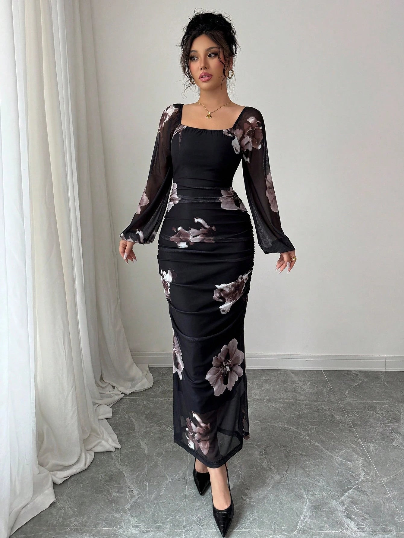 Modelyn Women's Floral Print Elegant Square Neck Tie Waist Midi Dress Maxi Women Outfit Long Evening Dresses
