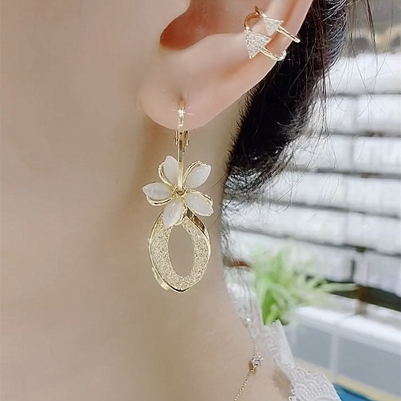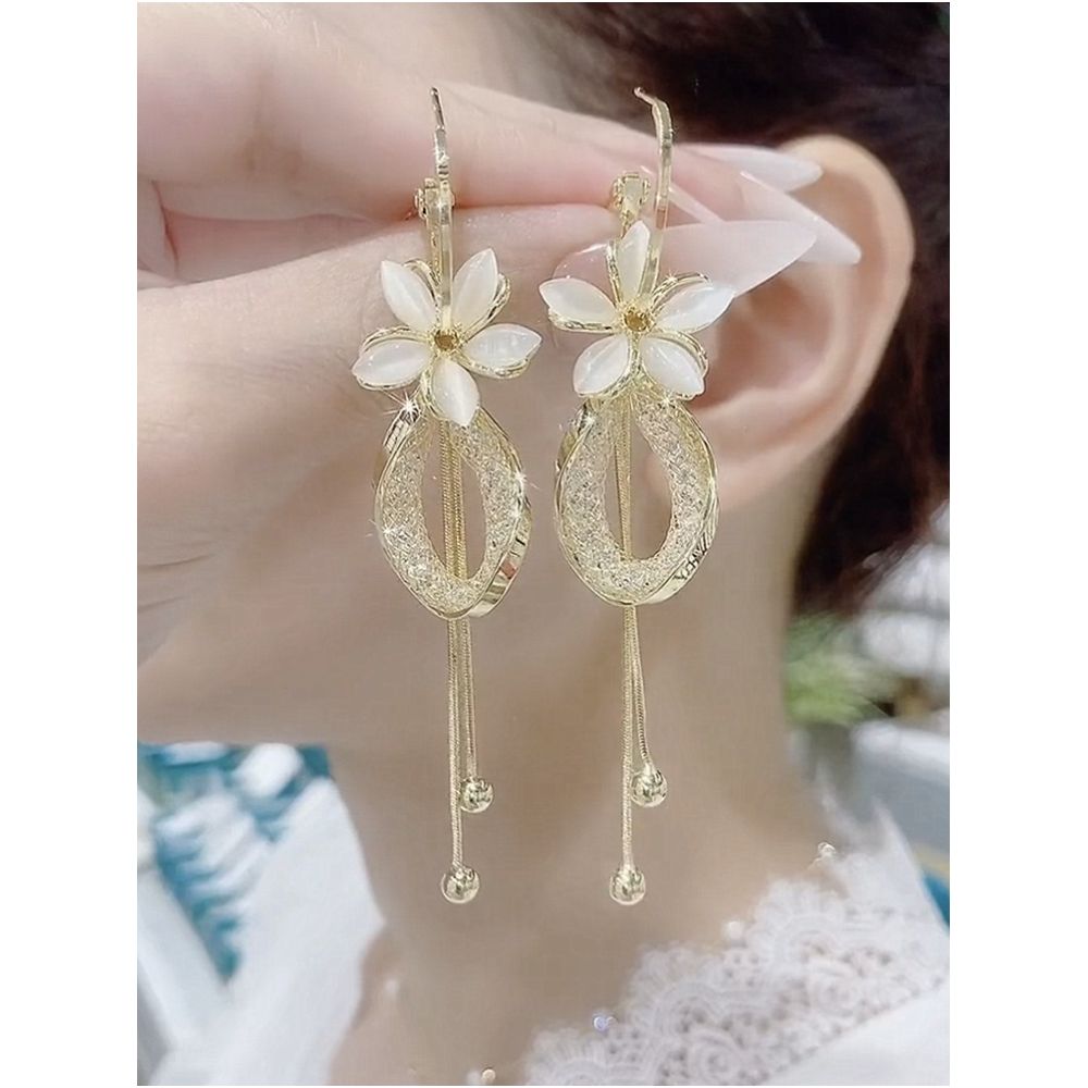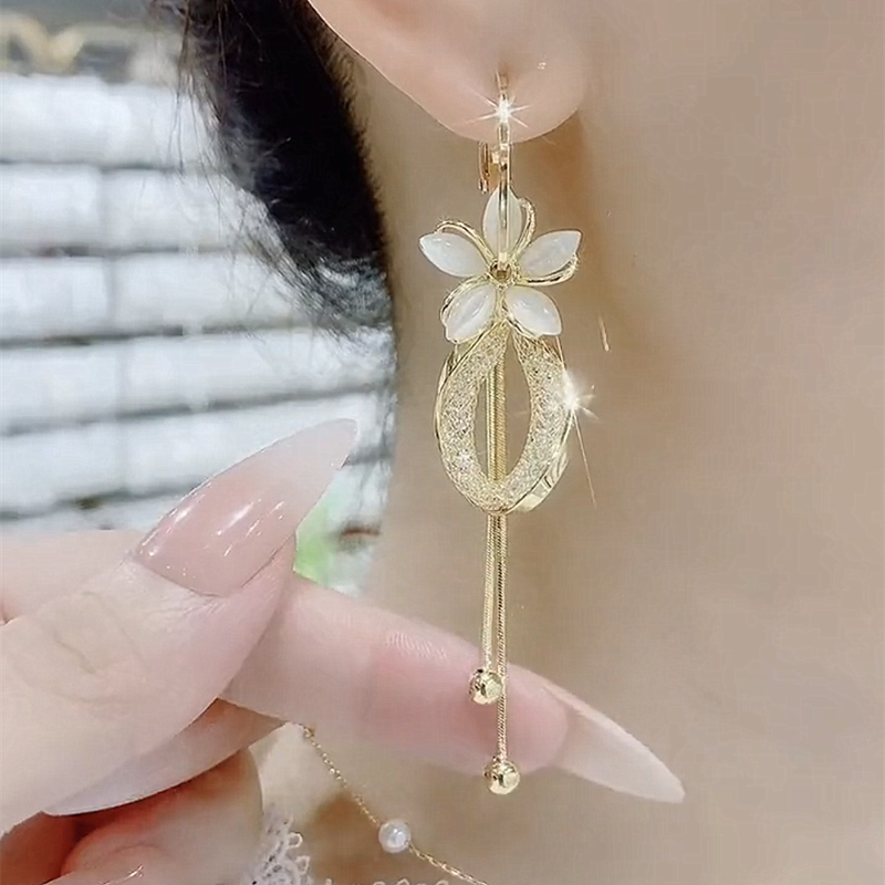 New trendy cat eye stone petal earrings with two straps high end feel pure silver needle temperament fashionable long and versatile earrings