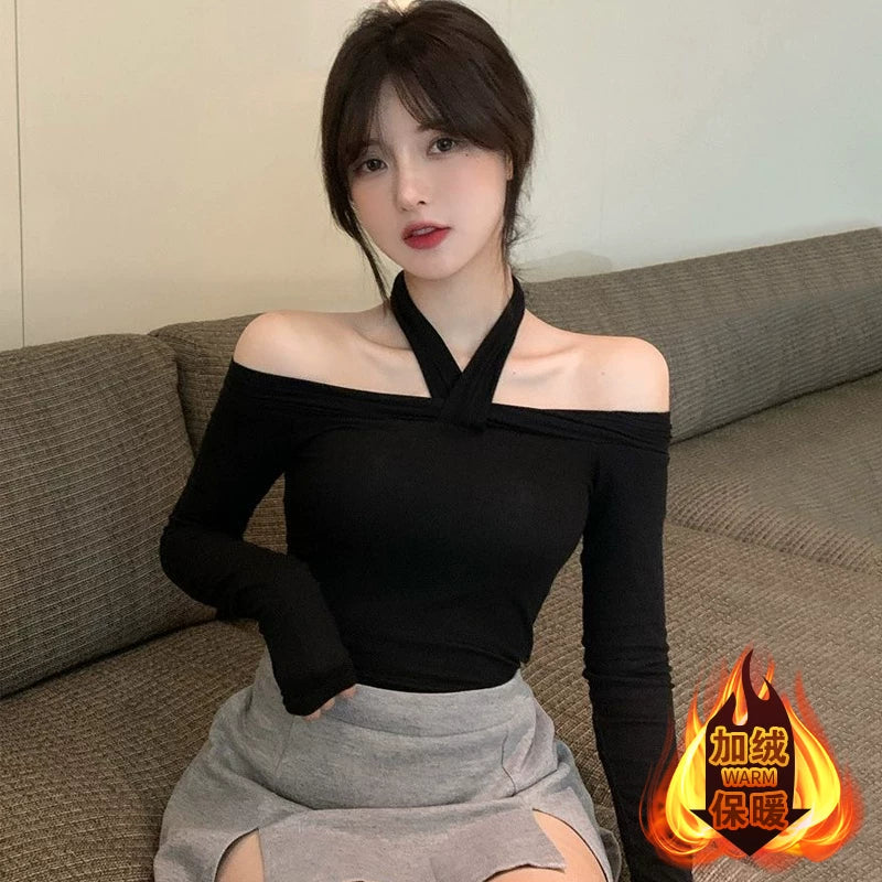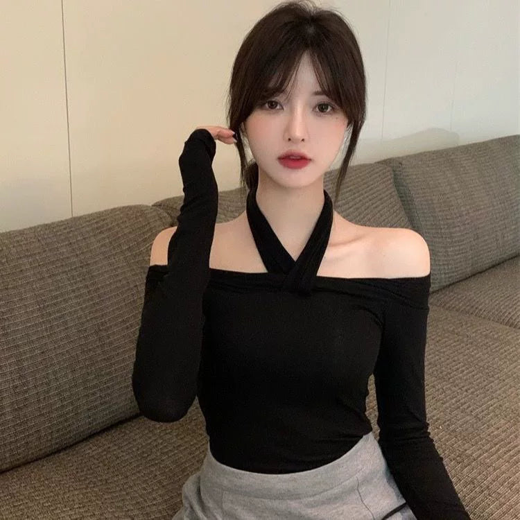 Off-the-shoulder halter neck sexy off-the-shoulder top women's autumn and winter slim fit long sleeve t-shirt women's black fashionable and versatile base layerOff-the-shoulder halter neck sexy off-the-shoulder top women's autumn and winter slim fit long