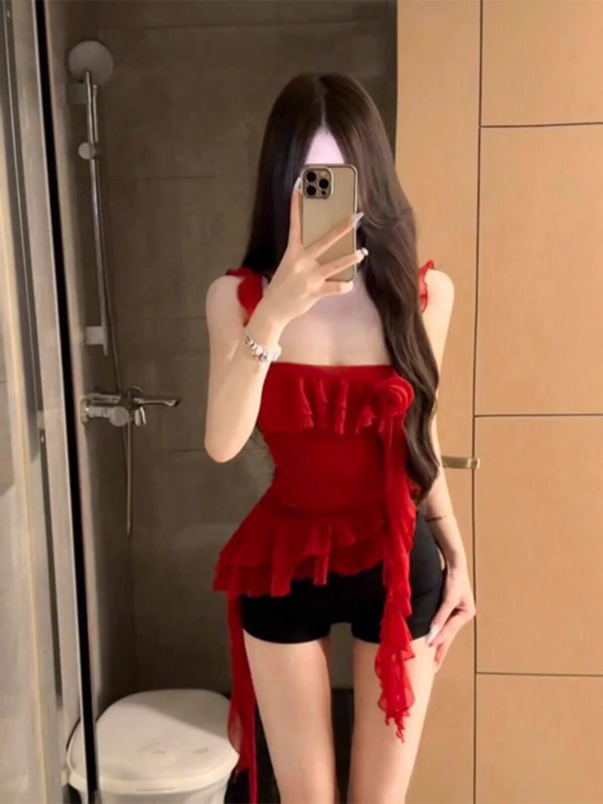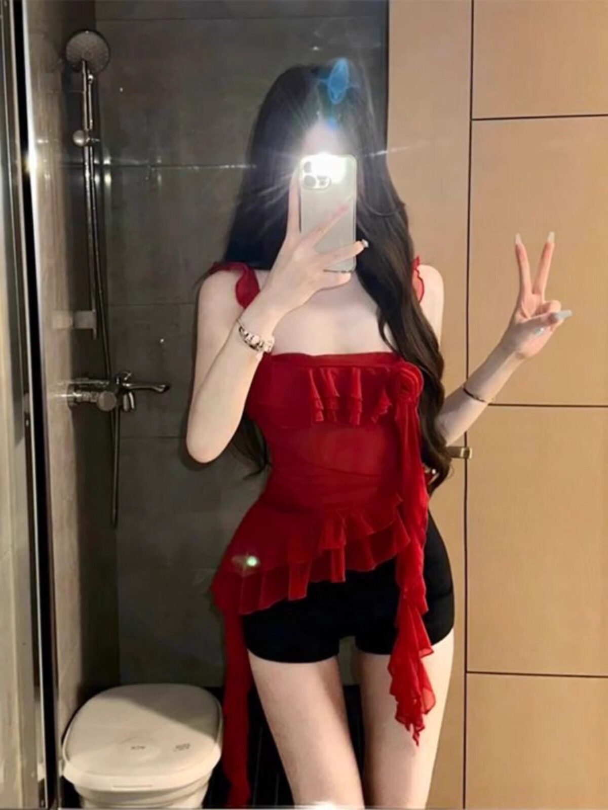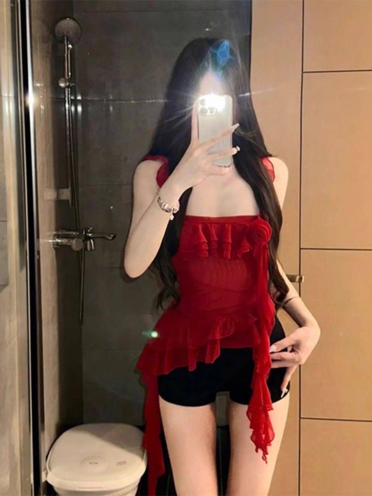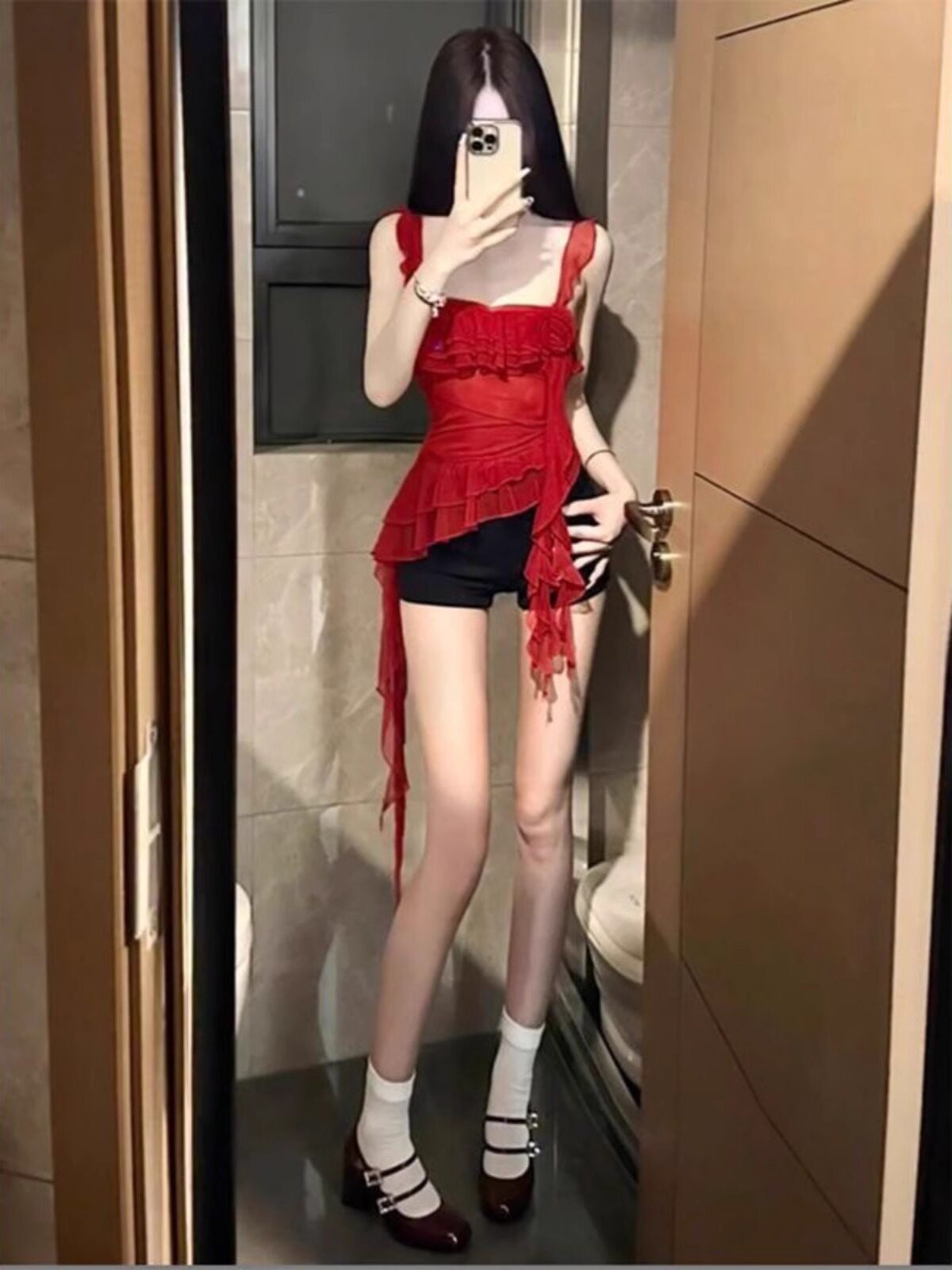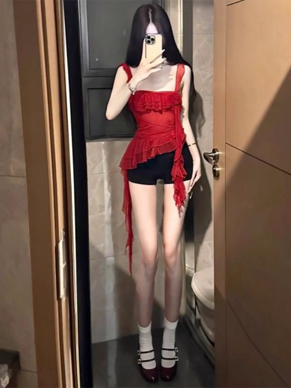 Pure Desire Style Spicy Girl Design Feel Drift Belt Mesh Strap Tank Top Irregular Sleeveless Top Shorts Set for Women Summer