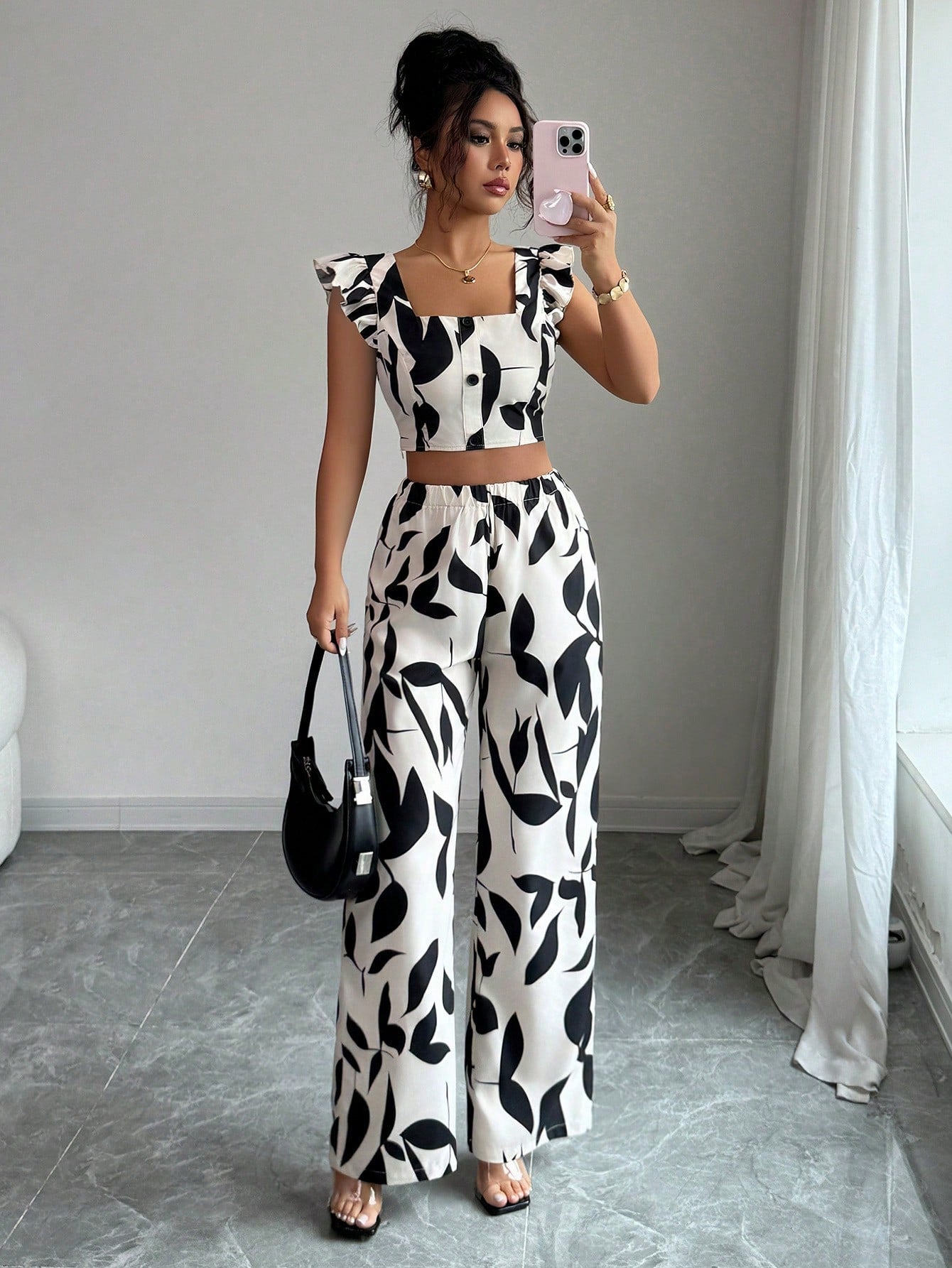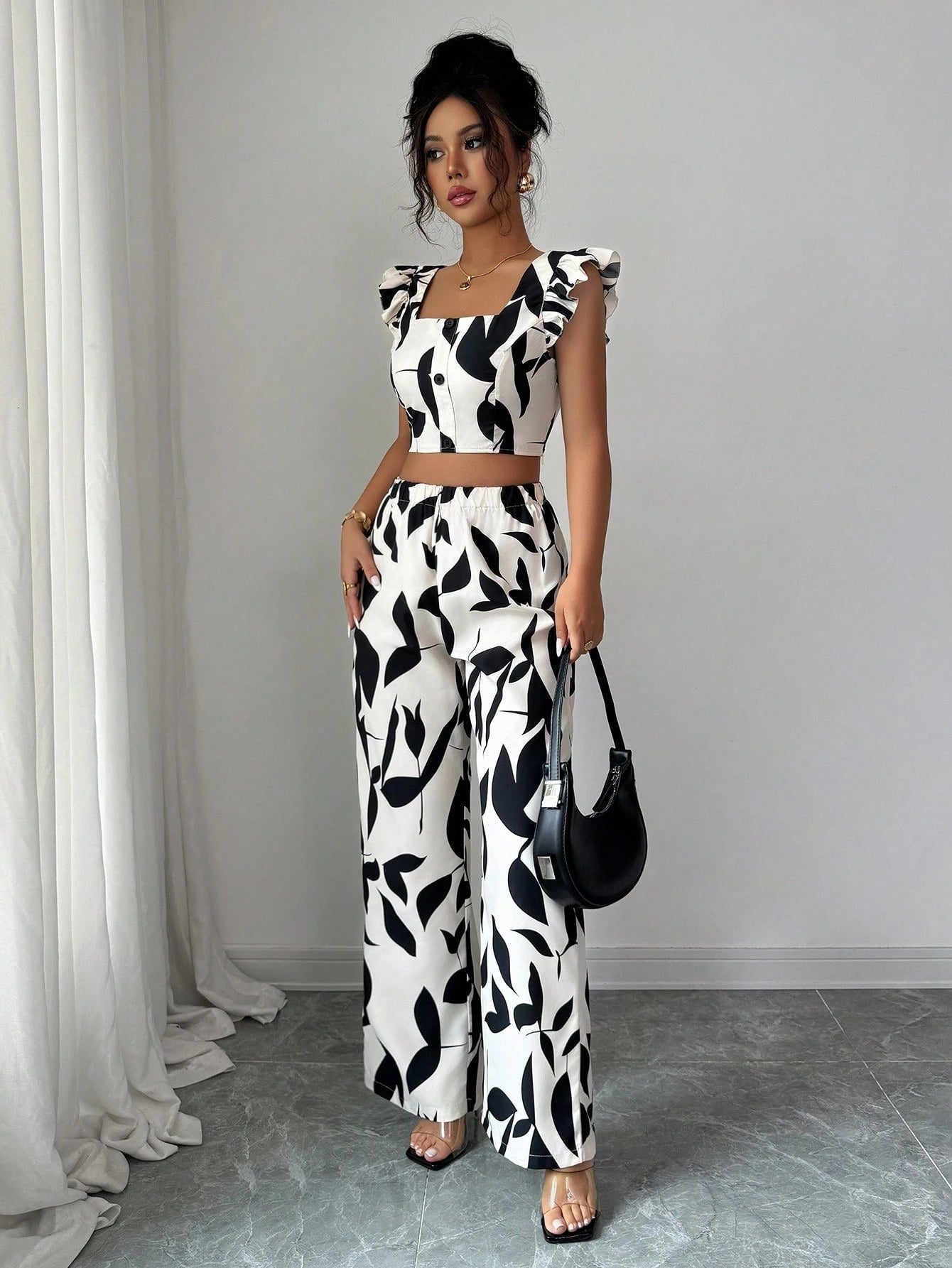 • Selianne 2pcs Women Summer Casual Full Print Ruffle Hem Crop Top And Long Pants Set