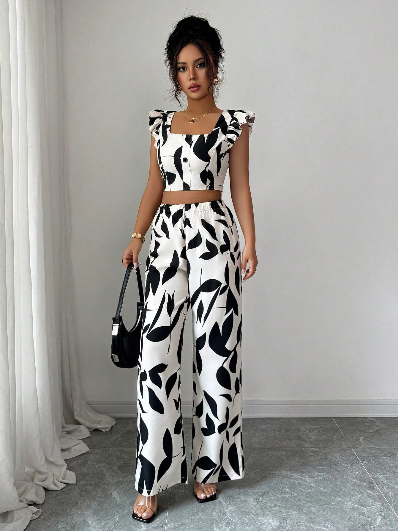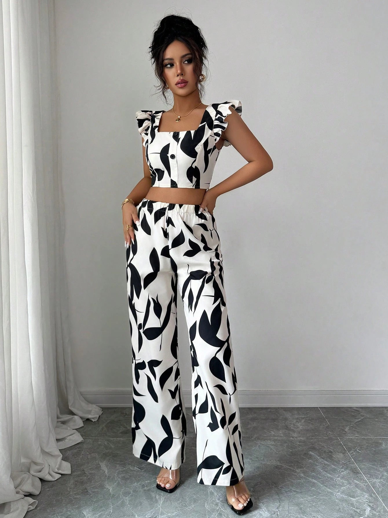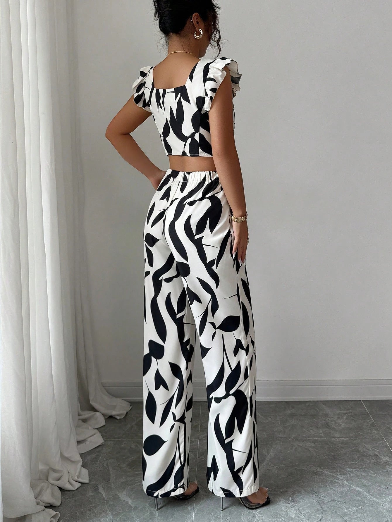 Selianne 2pcs Women Summer Casual Full Print Ruffle Hem Crop Top And Long Pants Set