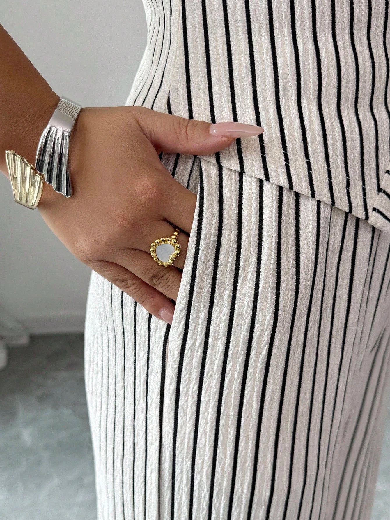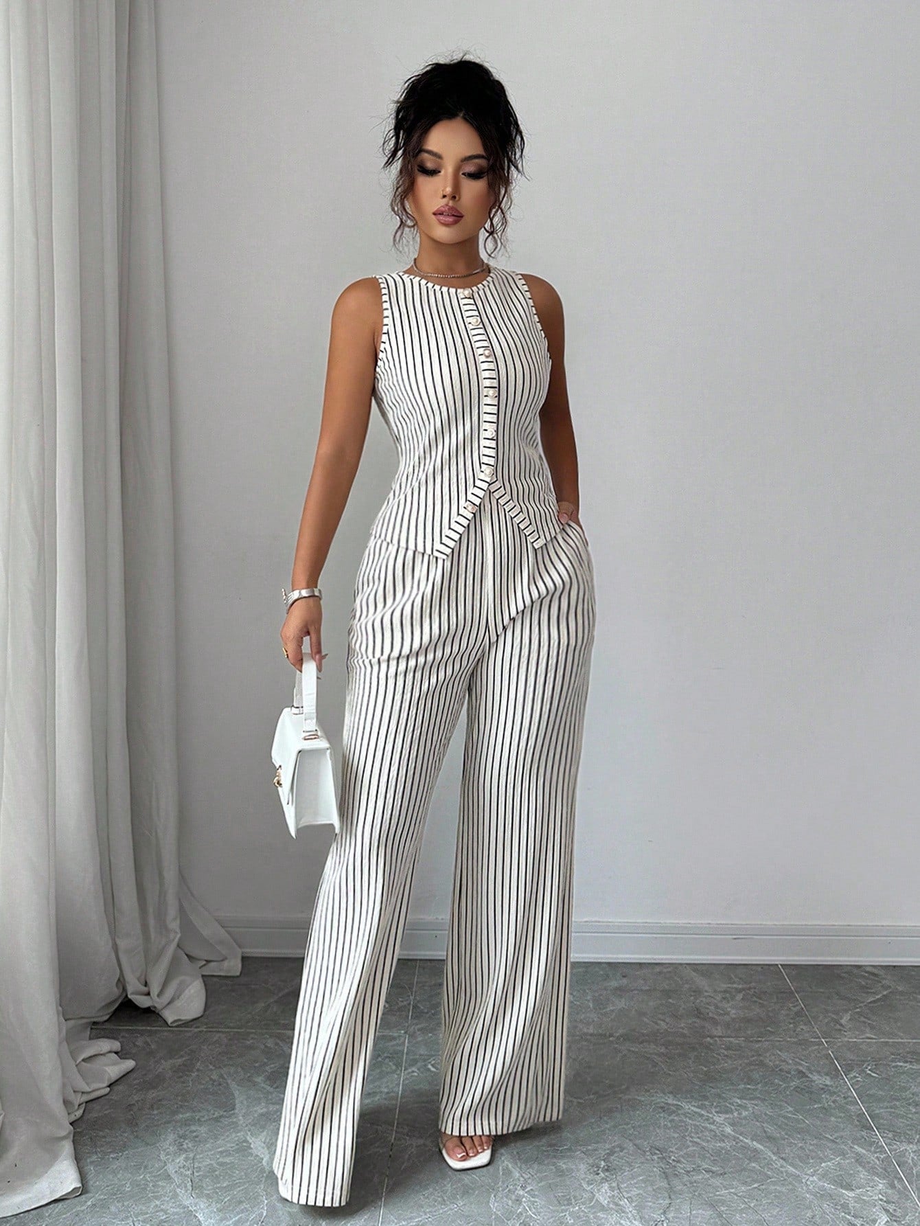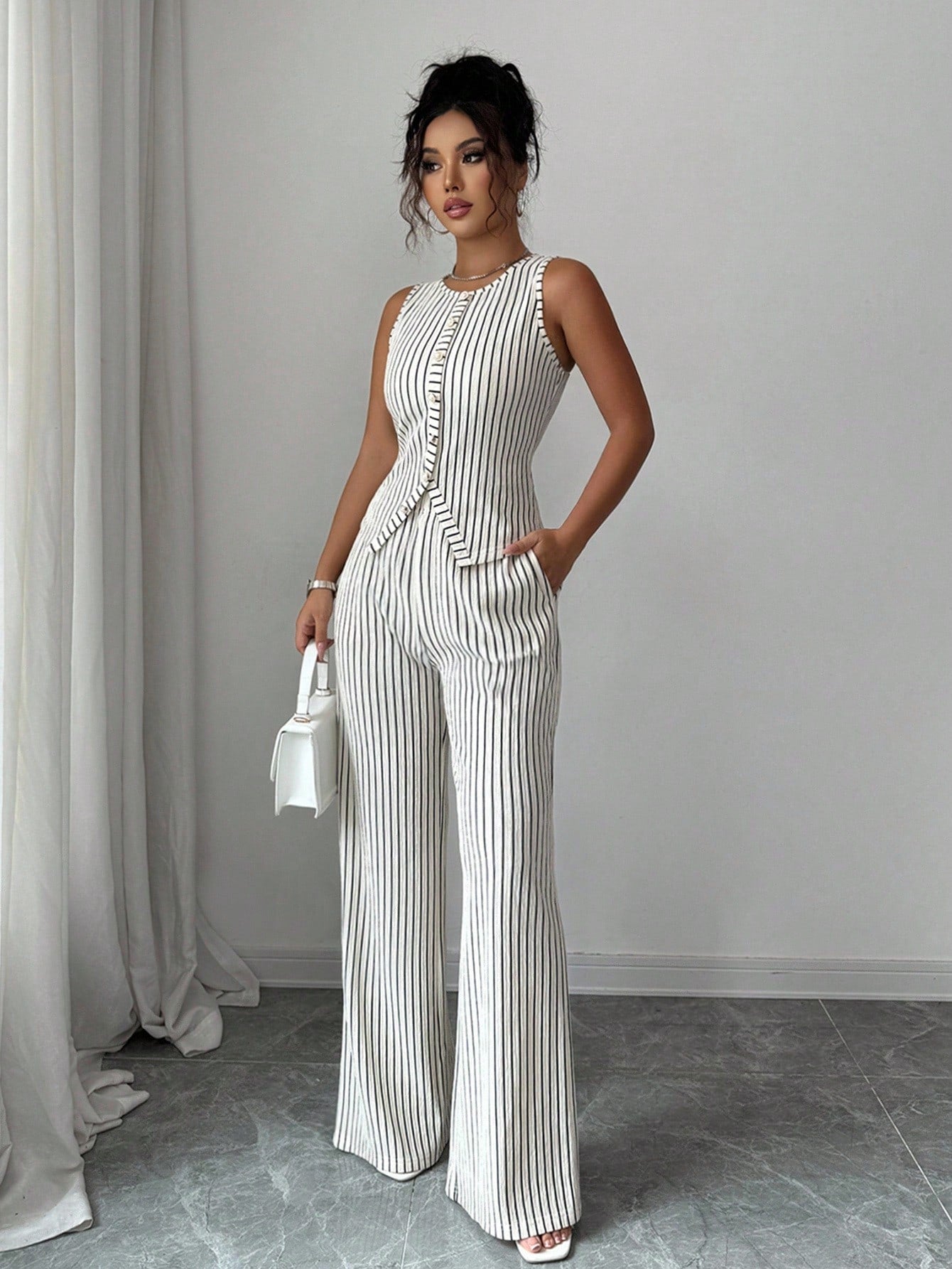 Selianne Elenzga Women's Fashionable Solid Color Textured 2-Piece Set, Including Sleeveless Crew Neck Button Fitted Tank Top And High Waist Loose Straight Leg Pants, Elegant Commuter Style