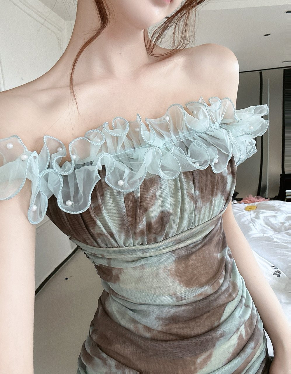 • Sexy off the shoulder floral print bodycon dress for women summer style textured pleated dress