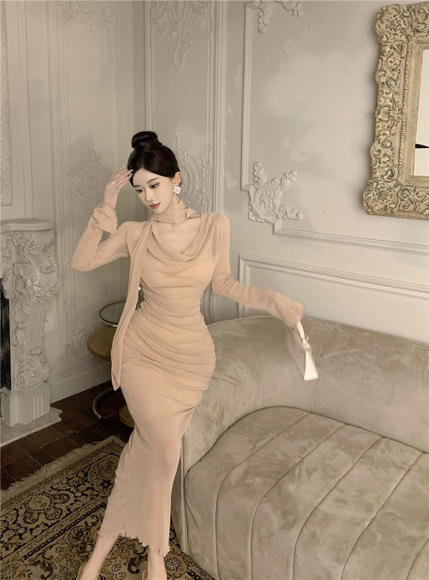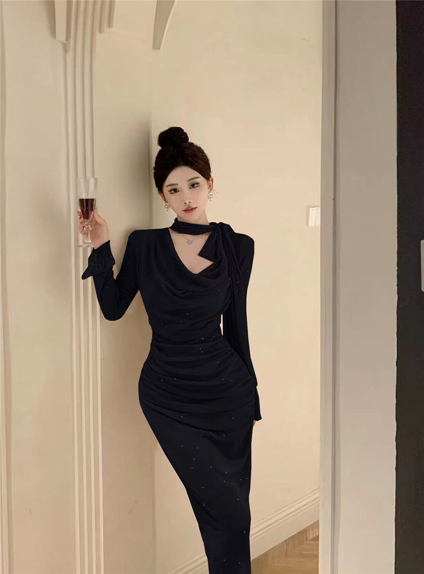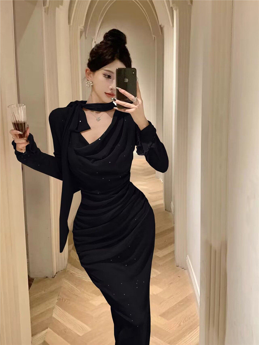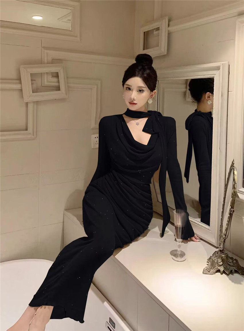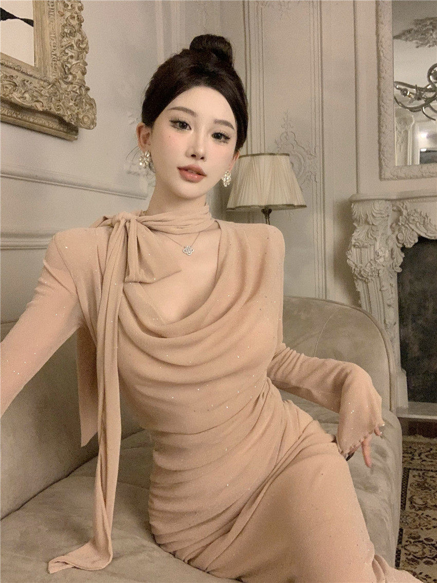 Sparkling bow tie loose collar flared sleeves waist cinching pleated mid length slimming dress 2025 autumn women s clothing