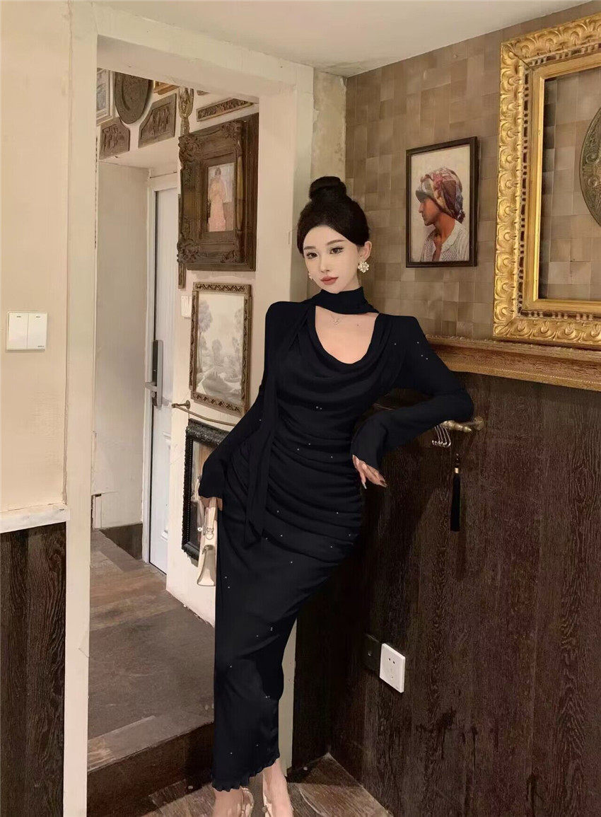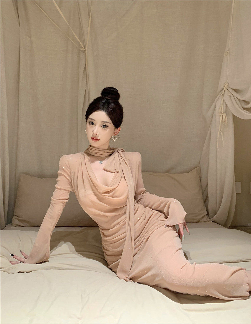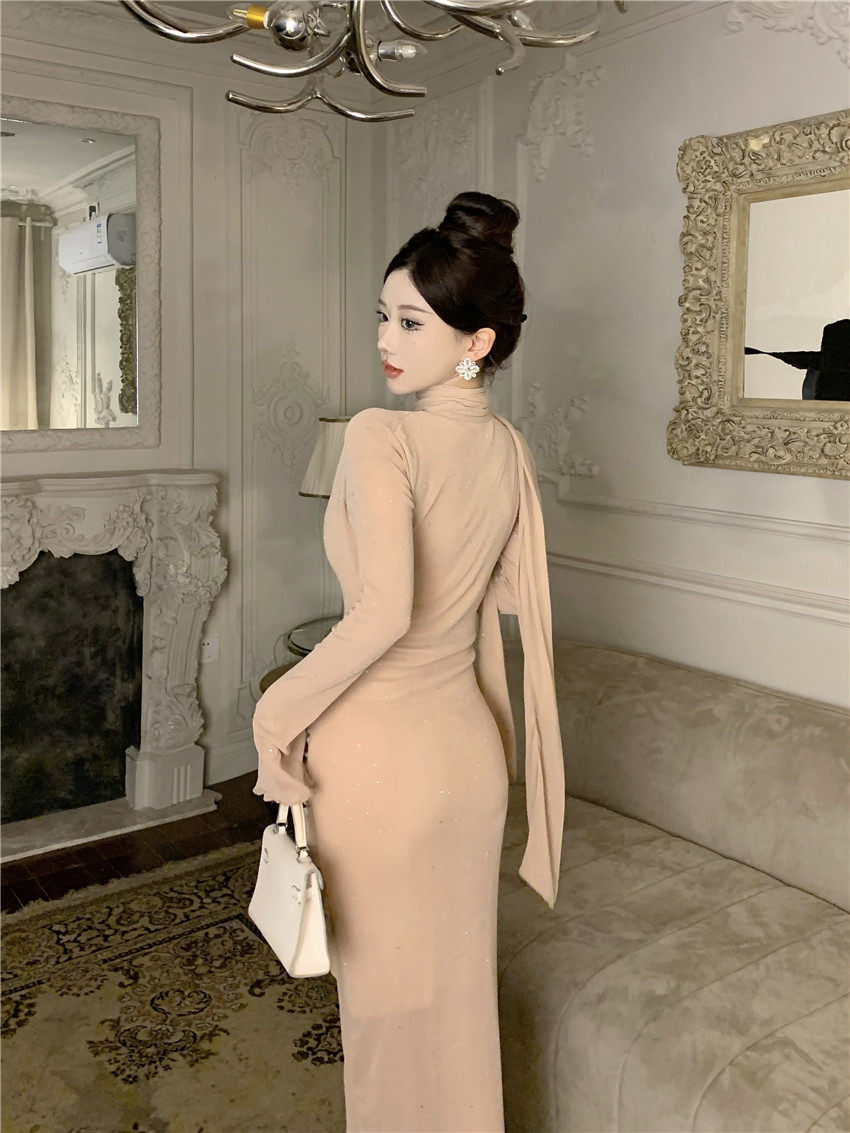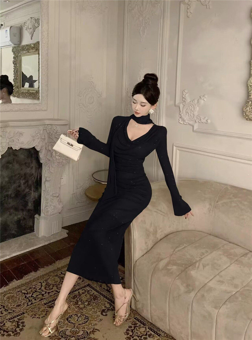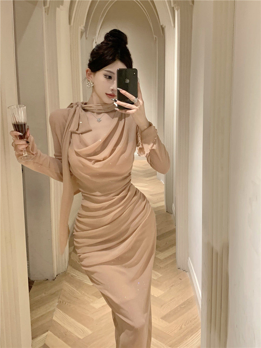 Sparkling bow tie loose collar flared sleeves waist cinching pleated mid length slimming dress 2025 autumn women s clothing