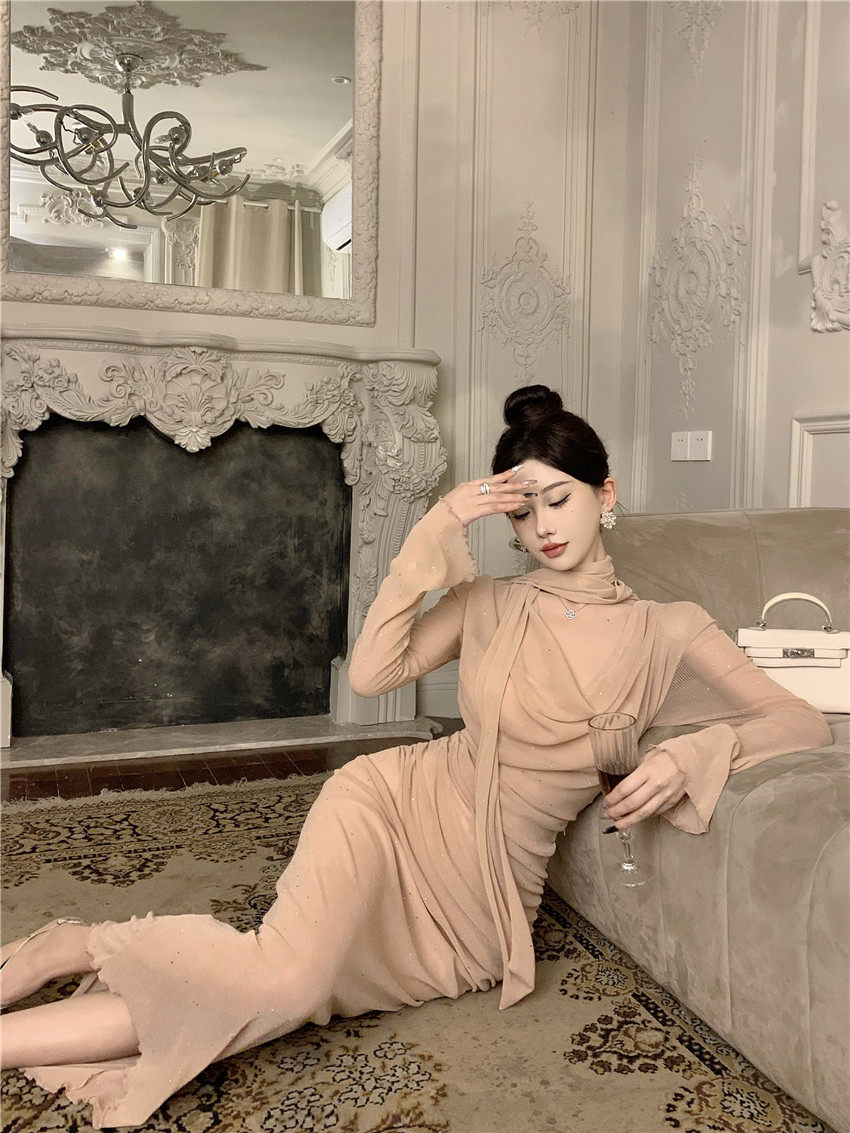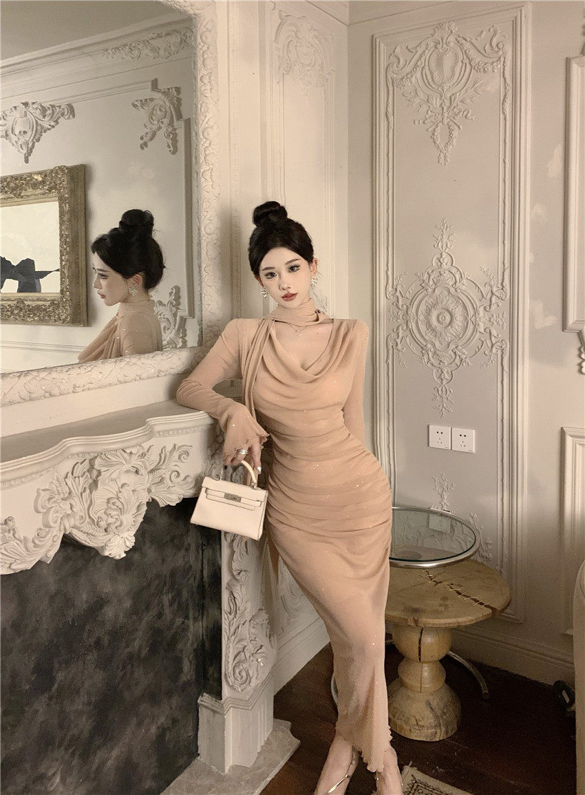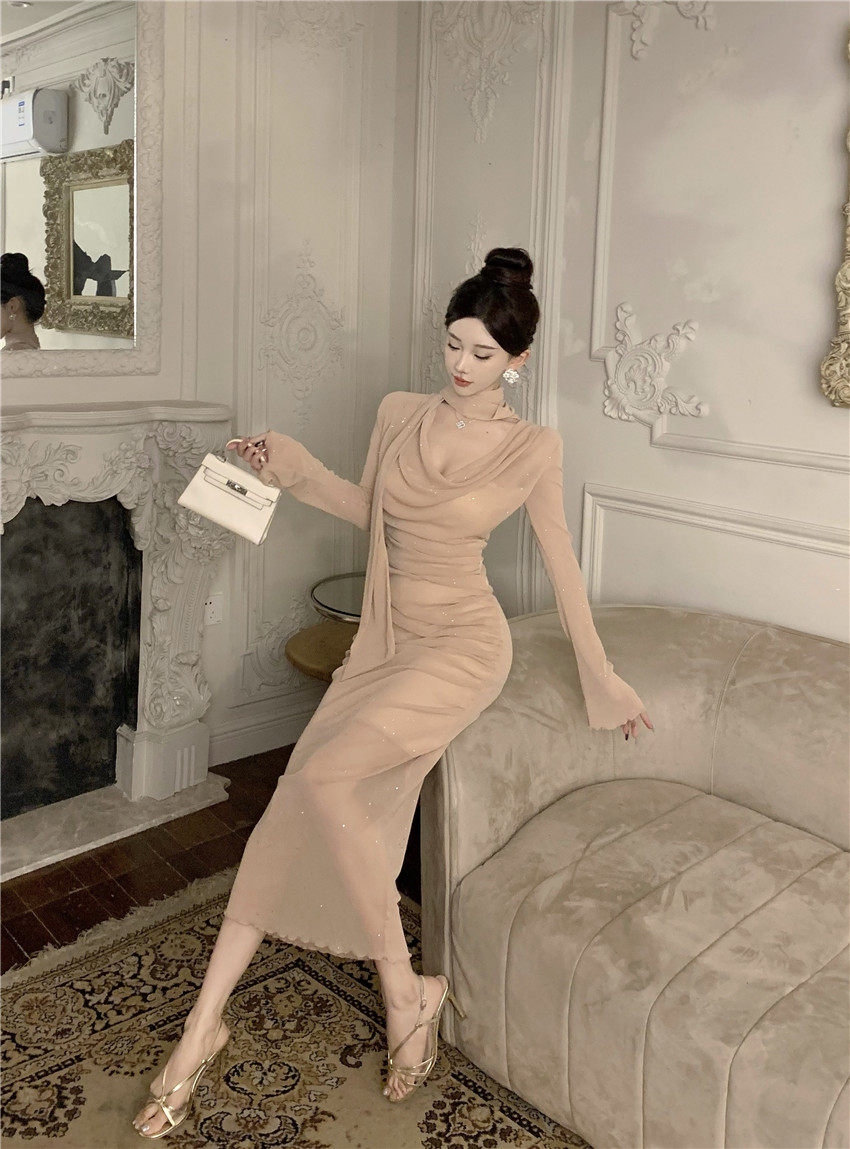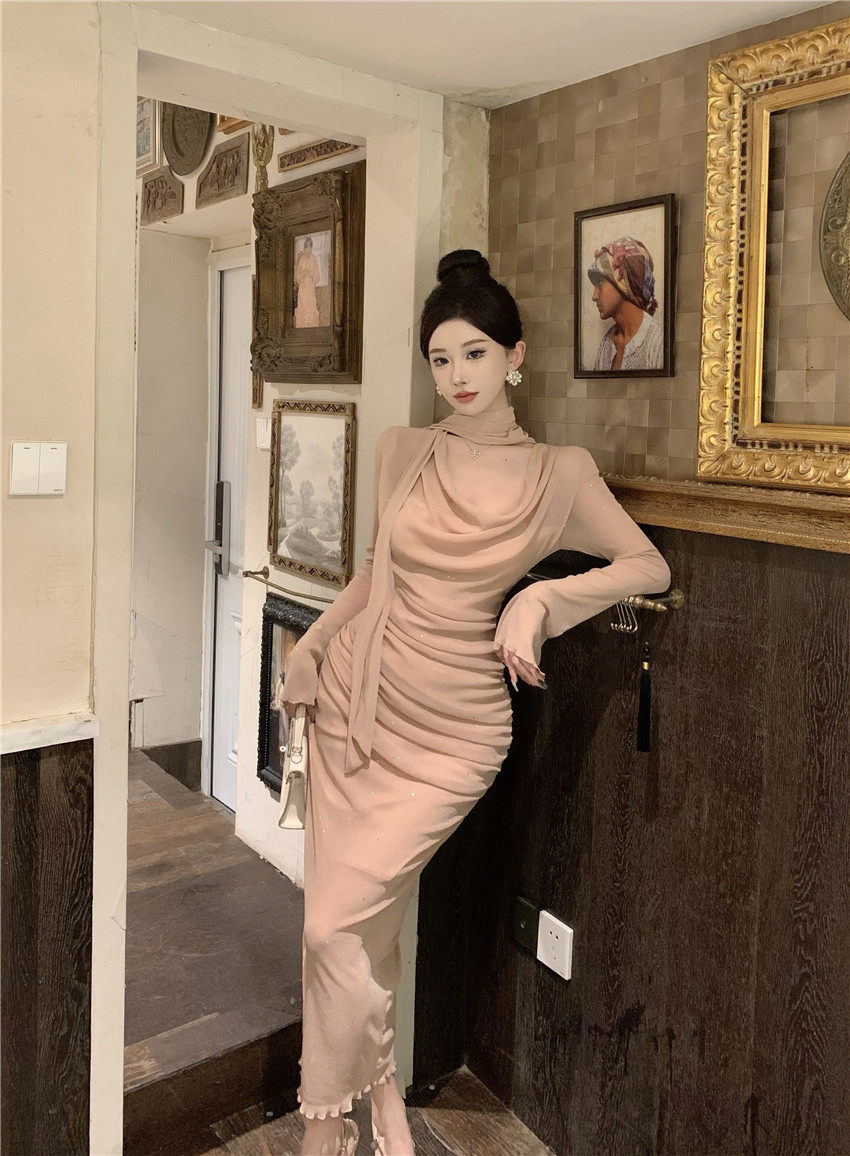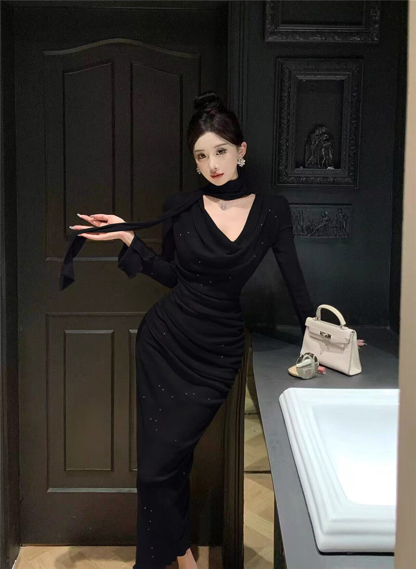 Sparkling bow tie loose collar flared sleeves waist cinching pleated mid length slimming dress 2025 autumn women s clothing