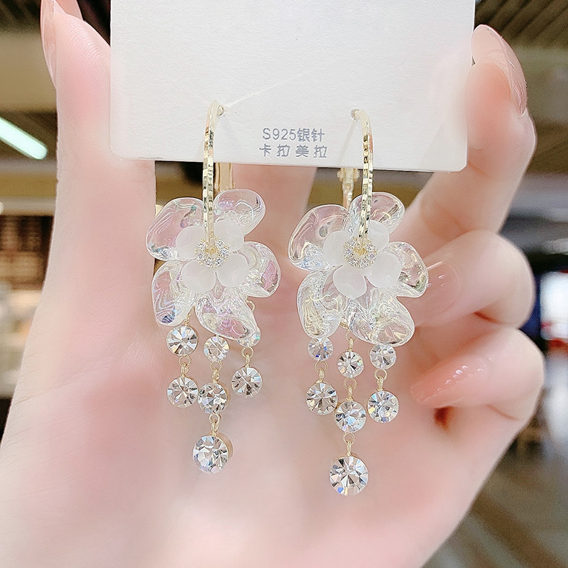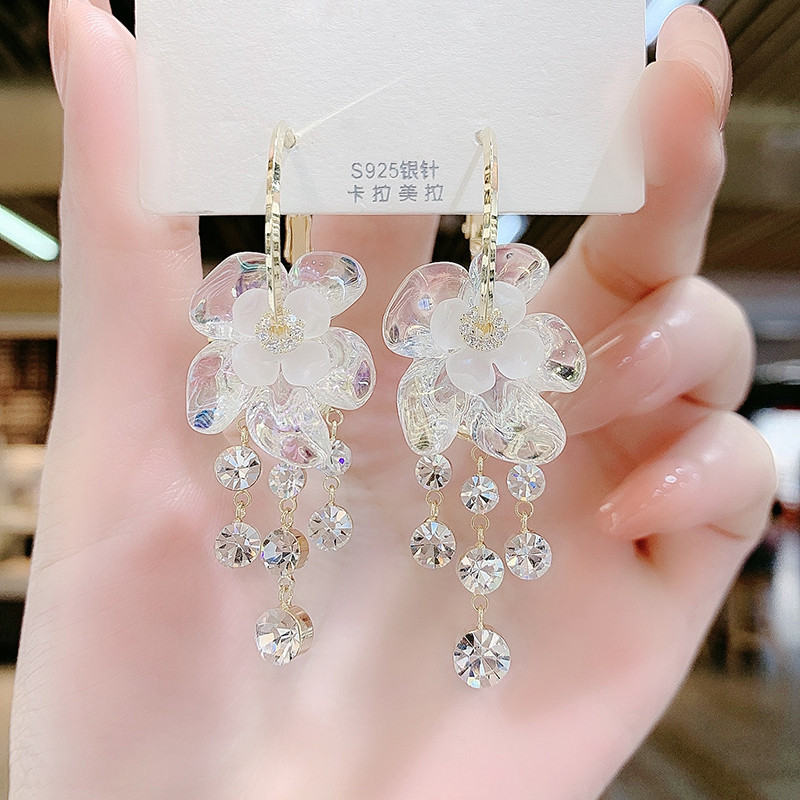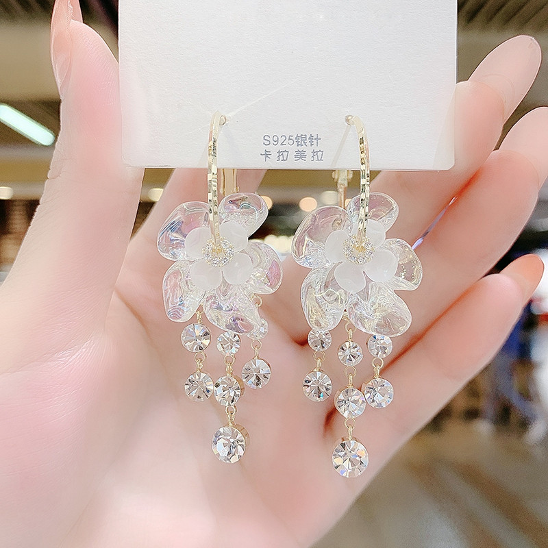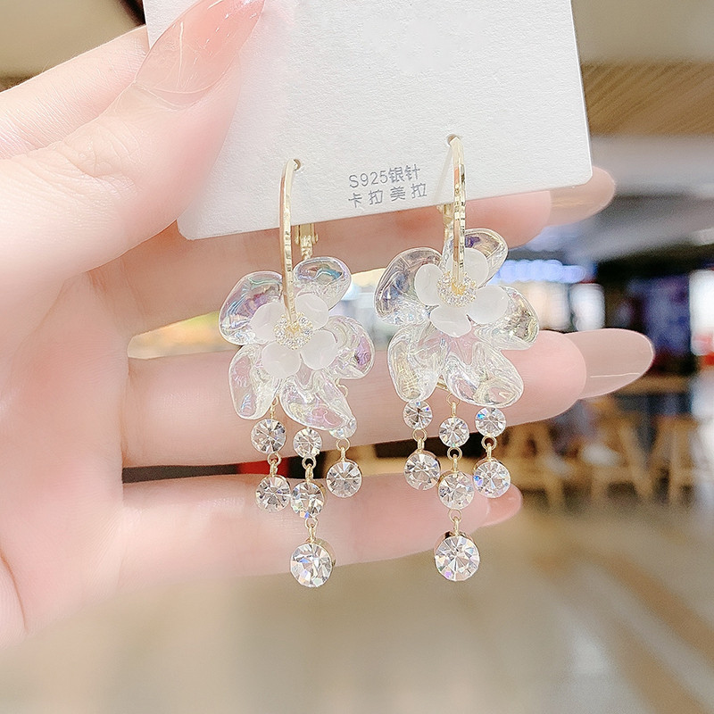 Super fairy white flower earrings with Korean temperament long diamond studded tassel earrings with a design sense internet famous earrings ear rings and earrings