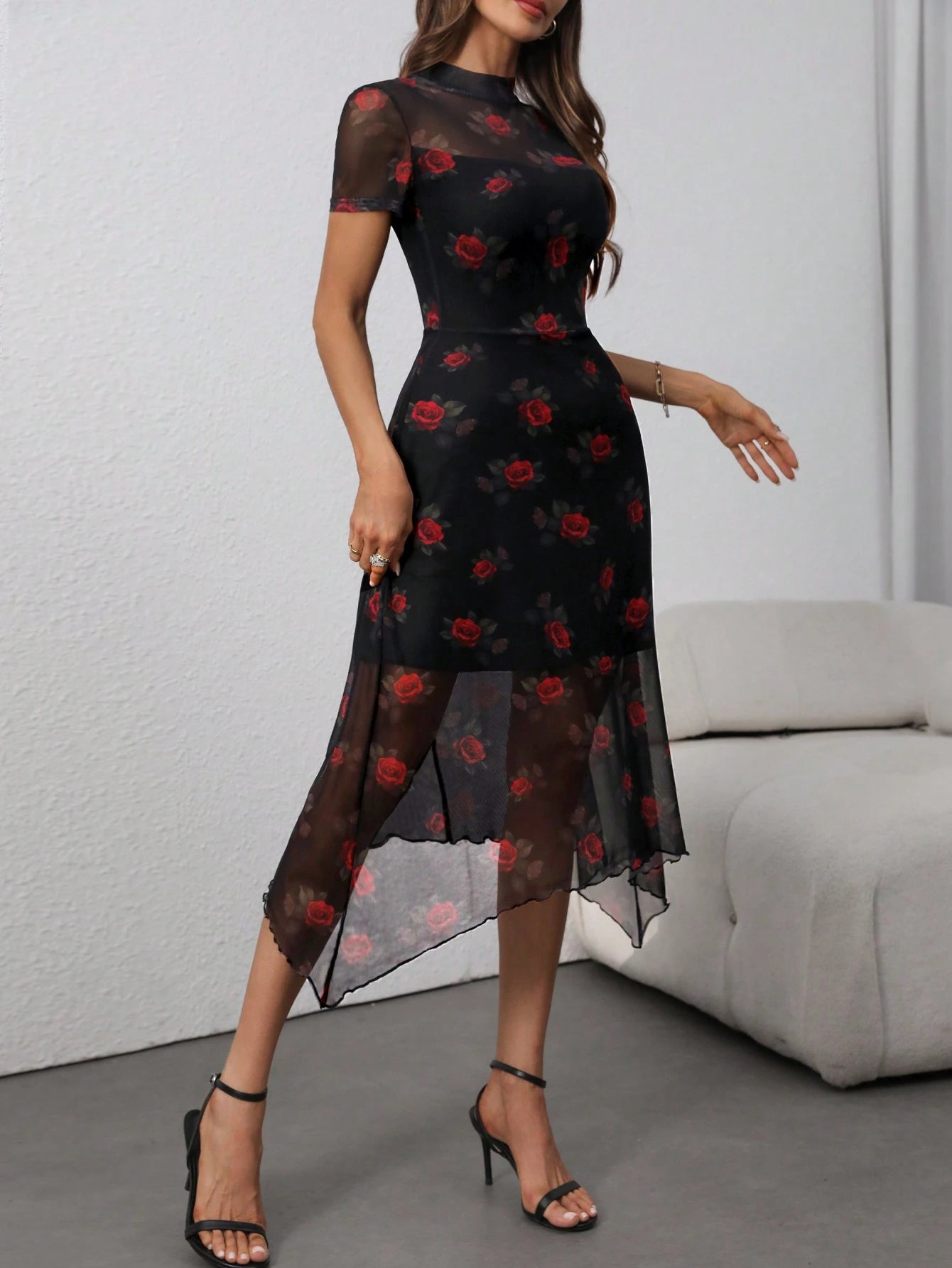Women Gothic Vintage Dark Gothic Rose Print Mesh Contrast Double Layer High Neck Fit & Flare Asymmetric Hem Dress